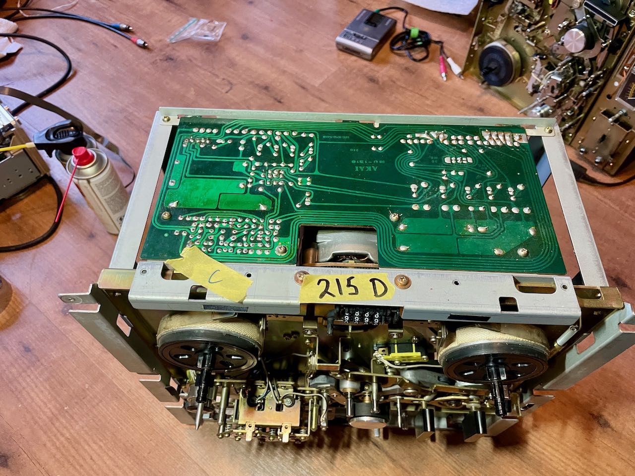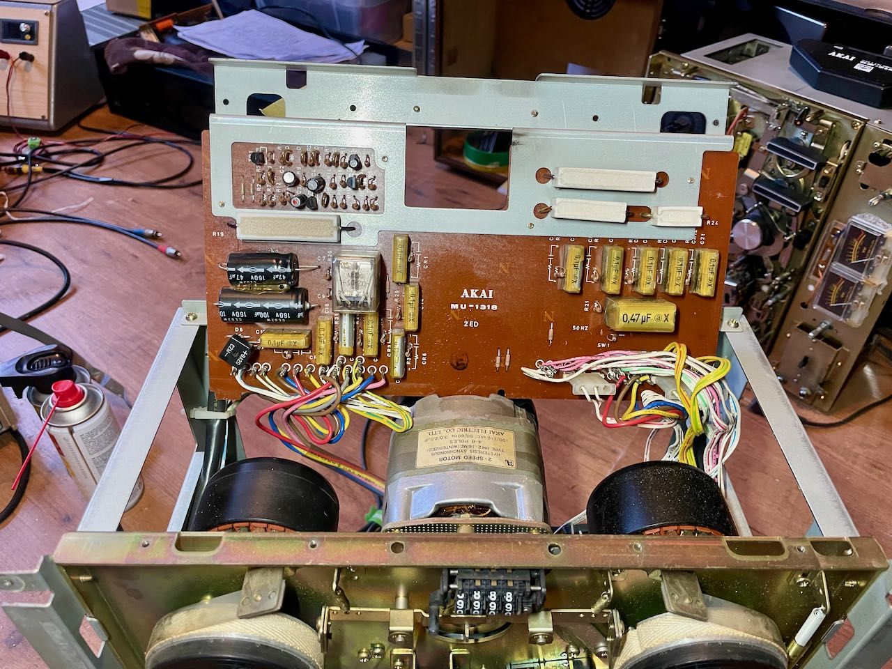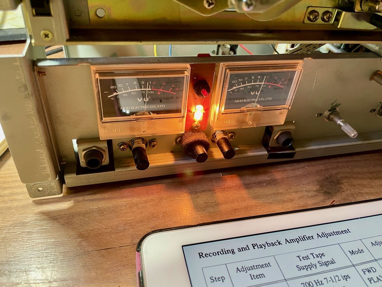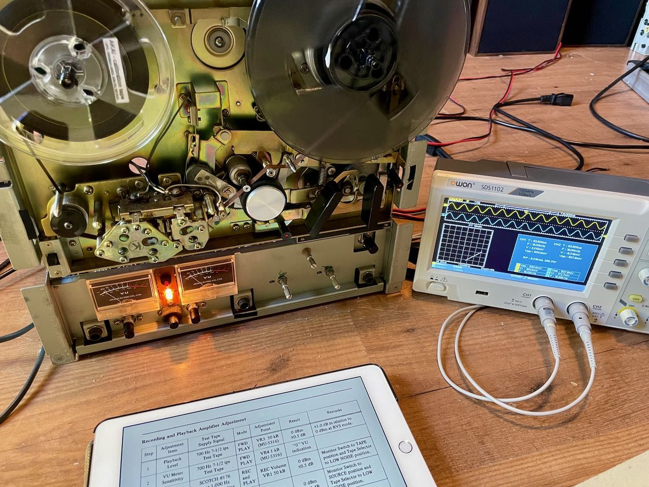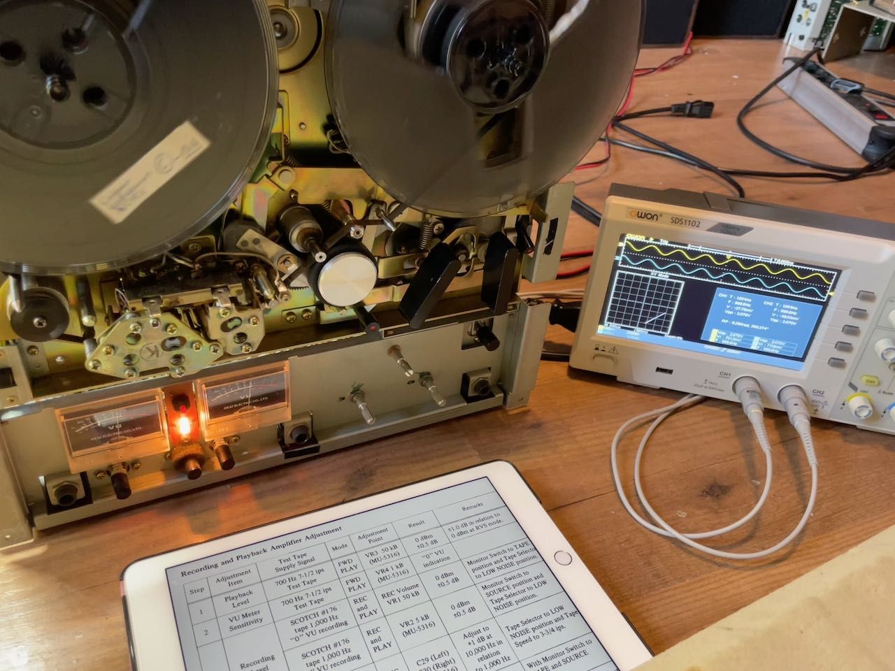 Eenmaal opgelapt was het tijd voor het afregelen. De Akai testband werd geplaatst en de oscilloscoop op de uitgang. Slechts een kleine correctie van de 0dB afstelling, een mini draai om de VU meter goed te zetten en een kleine opname correctie. Deze tussen 1977 en 1980 geproduceerde bandrecorder is als nieuw. De weergave bij zowel lage frequentie als 16kHz is verbazingwekkend goed. Wat is dit toch een heerlijke bandrecorder!