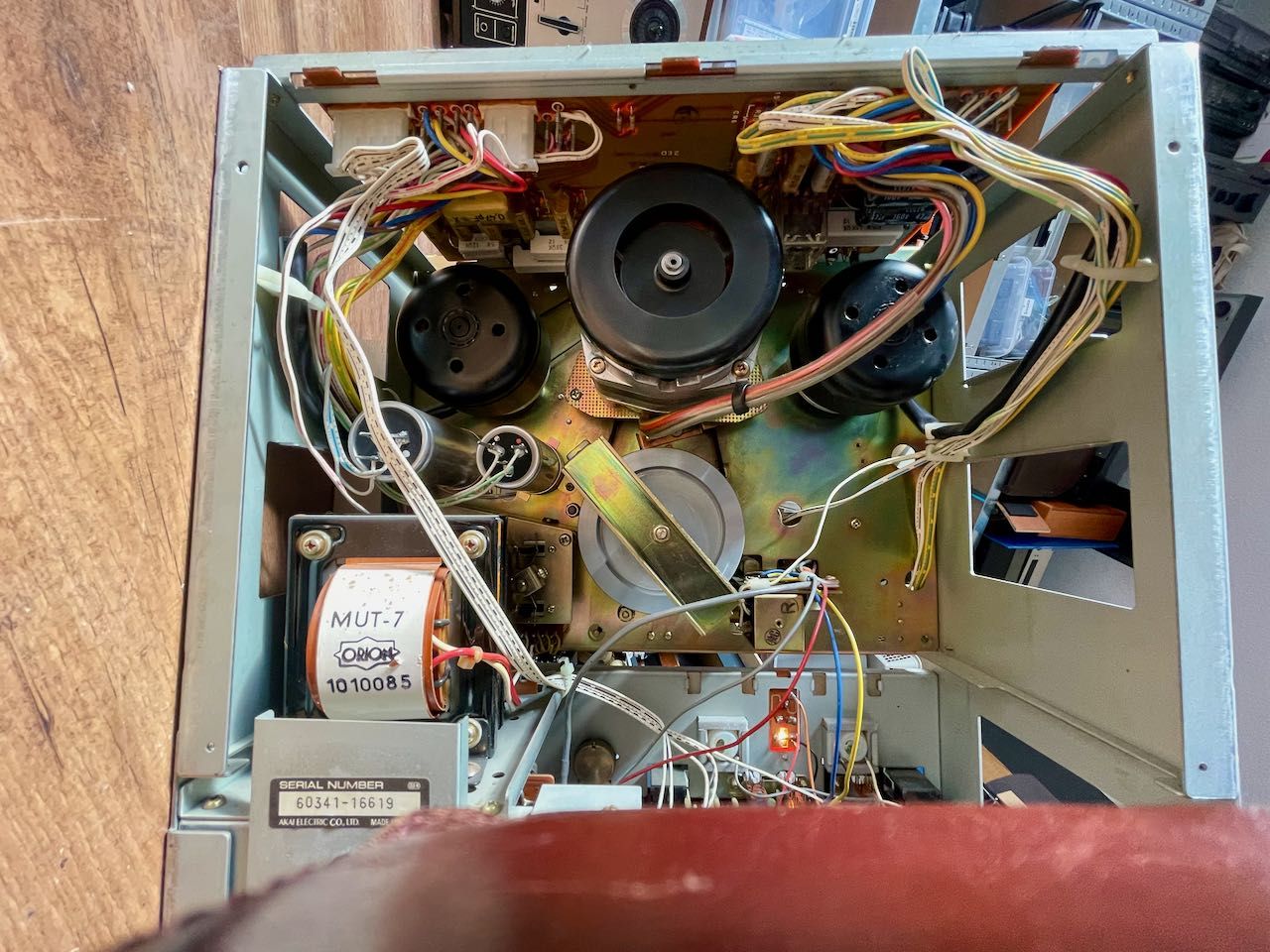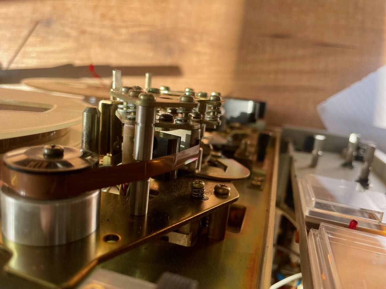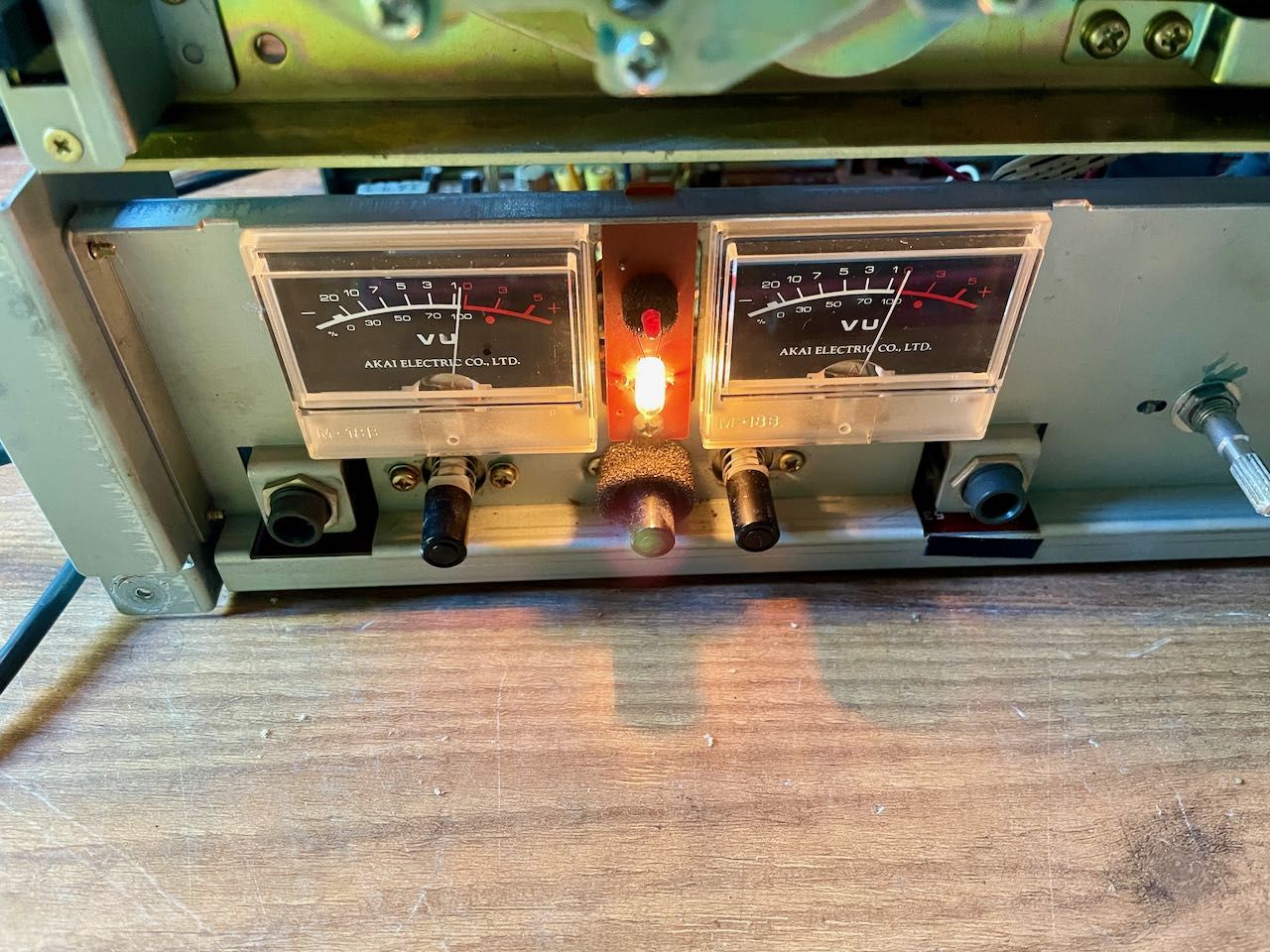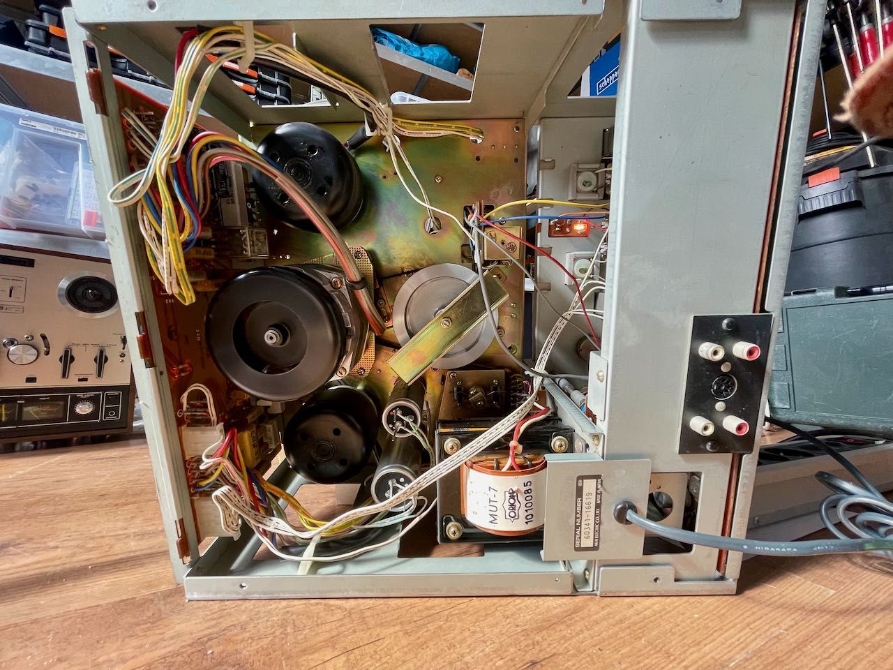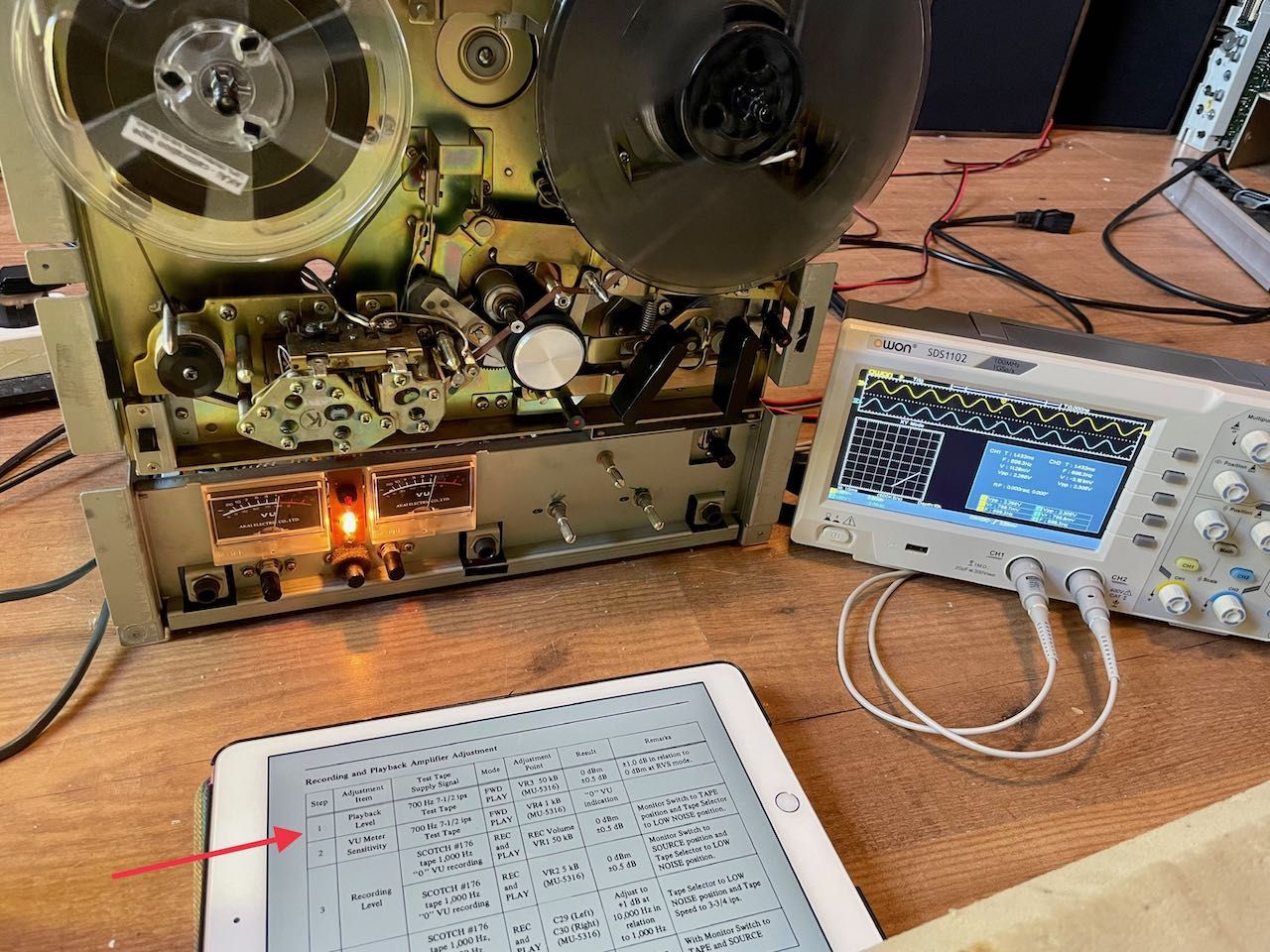 Eenmaal opgelapt was het tijd voor het afregelen. De Akai testband werd geplaatst en de oscilloscoop op de uitgang. Slechts een kleine correctie van de 0dB afstelling, een mini draai om de VU meter goed te zetten en een kleine opname correctie. Deze tussen 1977 en 1980 geproduceerde bandrecorder is als nieuw. De weergave bij zowel lage frequentie als 16kHz is verbazingwekkend goed. Wat is dit toch een heerlijke bandrecorder!