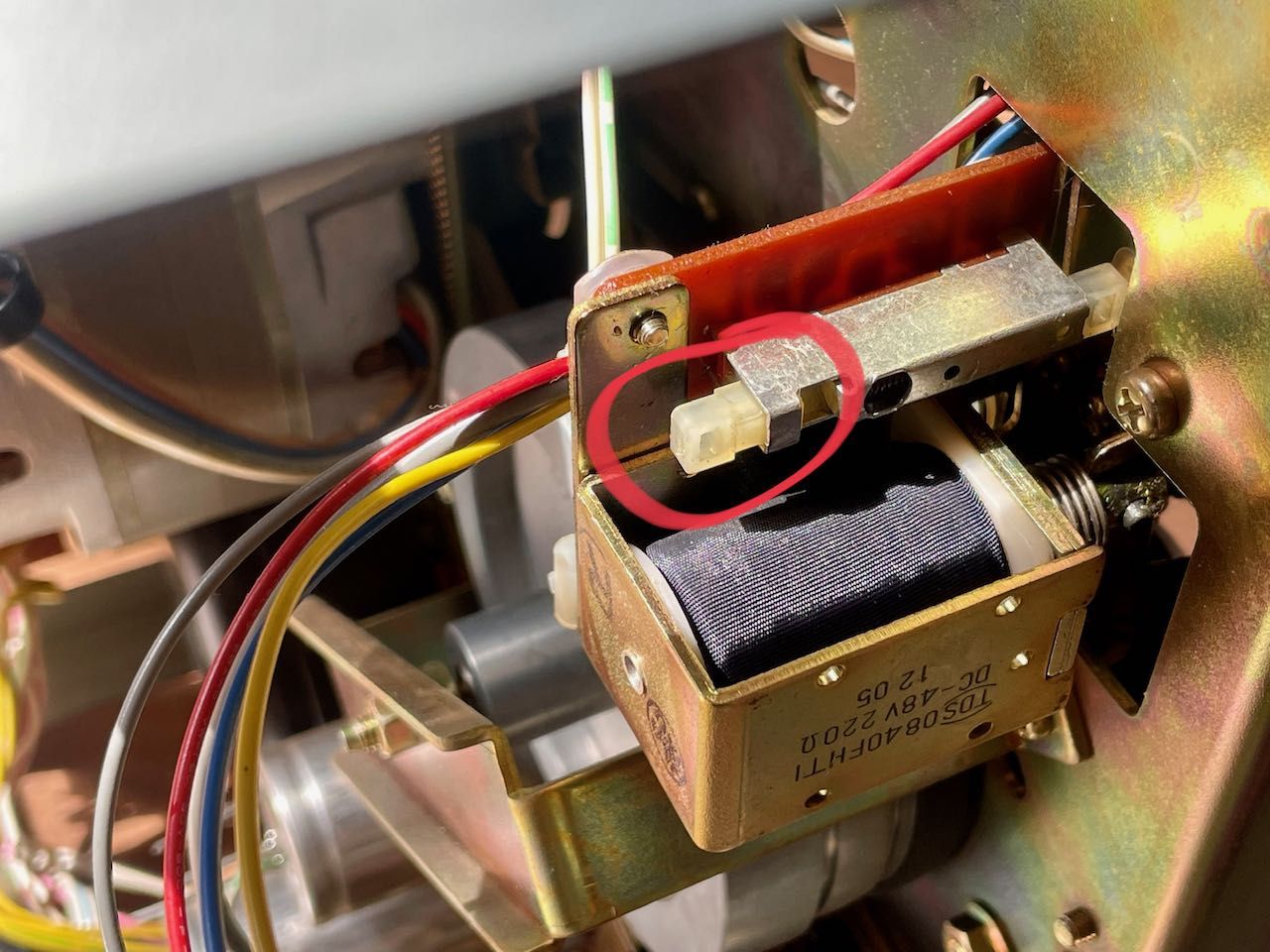 Na goed zoeken bleek de oplossing zeer eenvoudig. Door het meermaals draaien van de printplaat was er op de print één motoraansluiting losgekomen. Niet direct zichtbaar aangezien deze bruine draad nog vast leek te zitten. Na het opnieuw vastmaken van deze draad en het vervangen van de condensator/weerstand draaide de machine weer als een zonnetje.