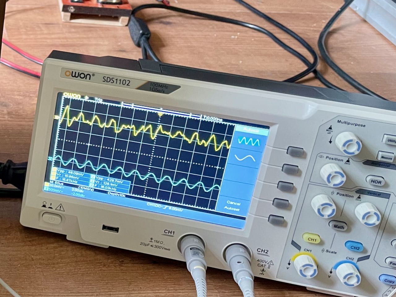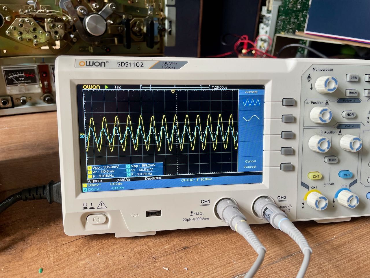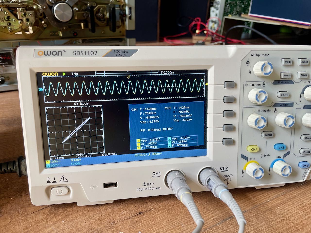 - 16kHz, 0dB -> Linker signaal is geen nette sinus. Via https://tapedeckforum.nl/index.php?board=2.0 er achter gekomen dat de kop waarschijnlijk versleten is. Vanaf zo'n 4kHz begint hij steeds minder strak weer te geven. Zie foto hiernaast/onder.