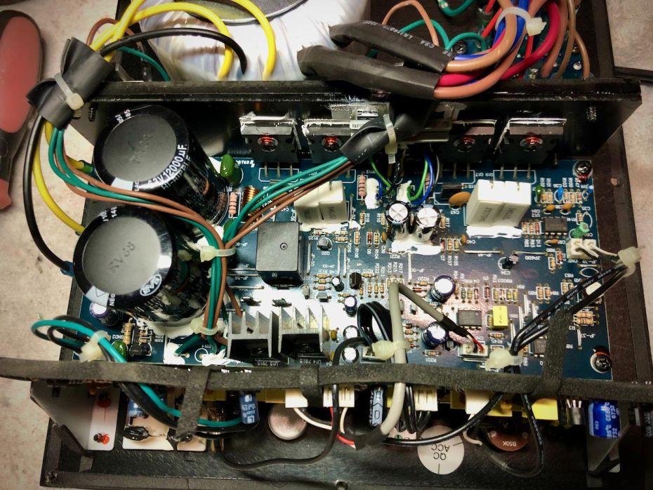 Op internet vond ik informatie over de reparatie van deze subwoofers. Klik hier voor de website. Klik hier voor het technische schema van de PSW-2500. Zo zijn er berichten over de +/- 15V voeding en diverse condensatoren. Ook zouden de weerstanden erg warm worden.