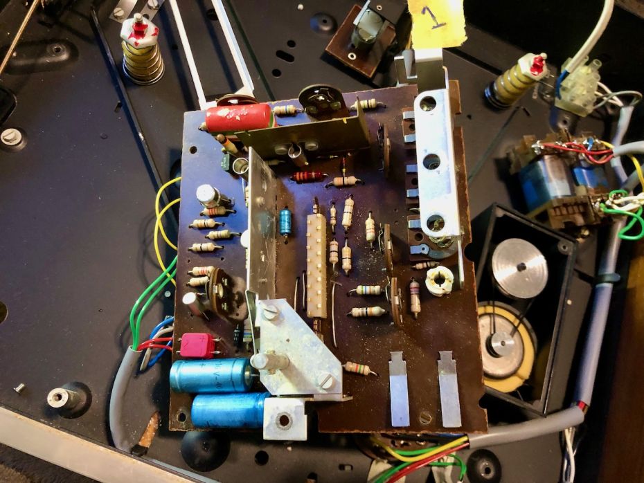 Ook het afregelen van de snelheid is erg omslachtig. Om de staande potmeters (grove afstelling) te kunnen instellen moet de gehele print losgemaakt worden zoals op de foto te zien. Om nu de snelheid te kunnen meten moet je alles weer in elkaar zetten. Is de snelheid nog niet goed dan moet je dit dus weer van voren af aan uitvoeren. Waarschijnlijk doe ik het fout en is er een handigere manier voor maar zo slim blijk ik dus niet te zijn.