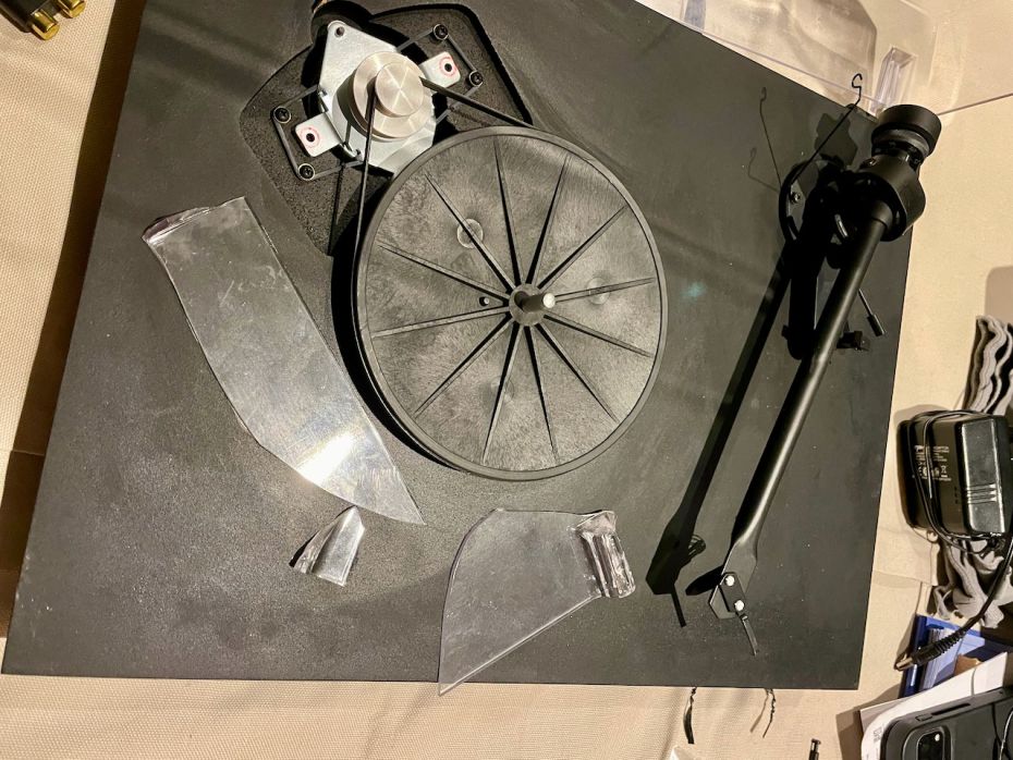 - De draaitafel mat, gemaakt van metaal, was losgekomen en heeft tijdens het vervoer zowel tegen de kunststof stofkap als de naald en arm zitten stoten.