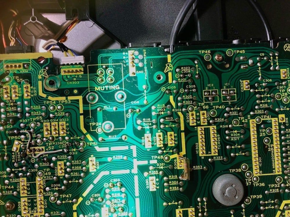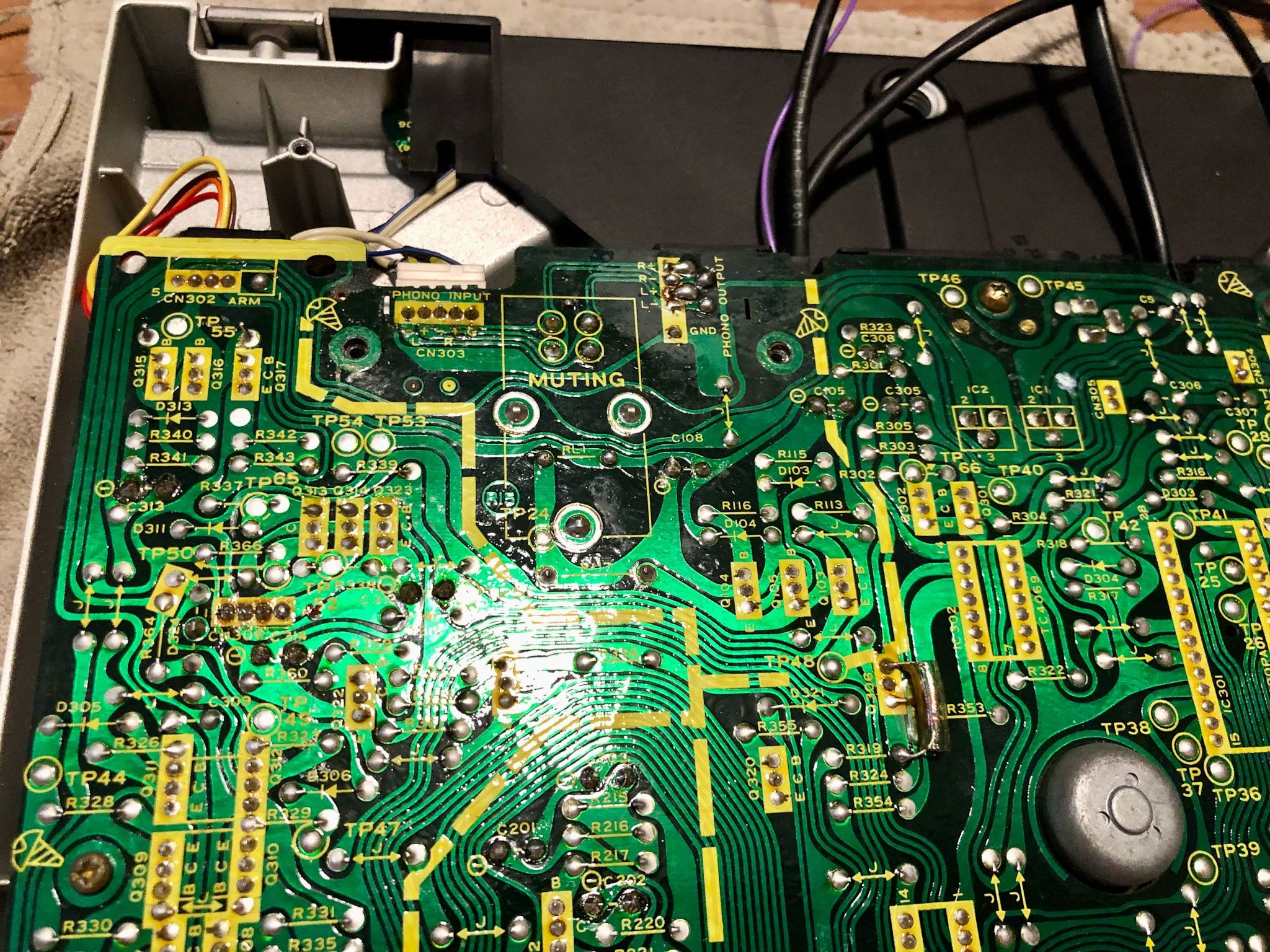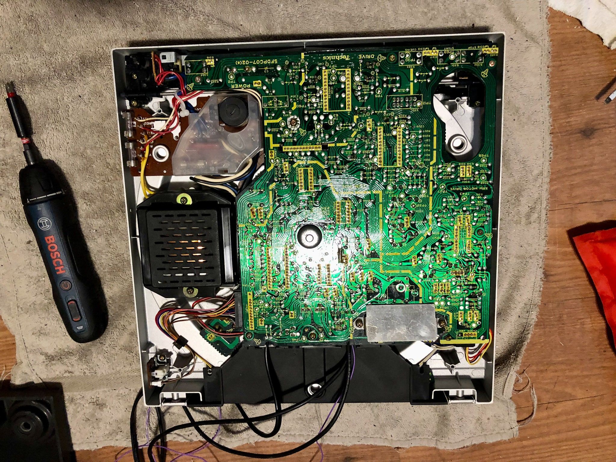 - Na het plaatsen de platenspeler weer in elkaar gezet (let op de vaste connector midden op de printplaat. ) en hij draait weer als nieuw.