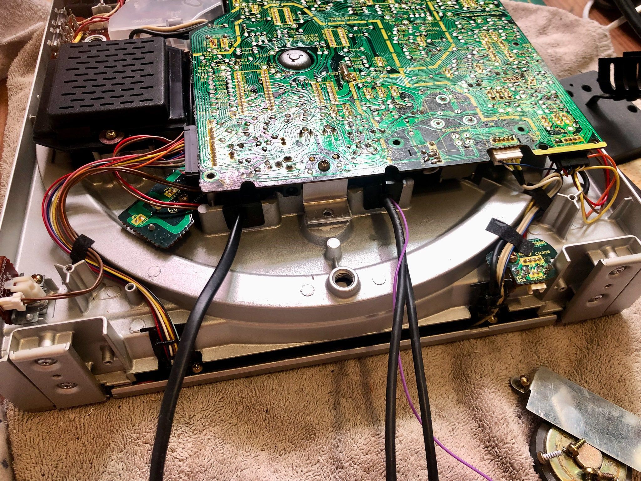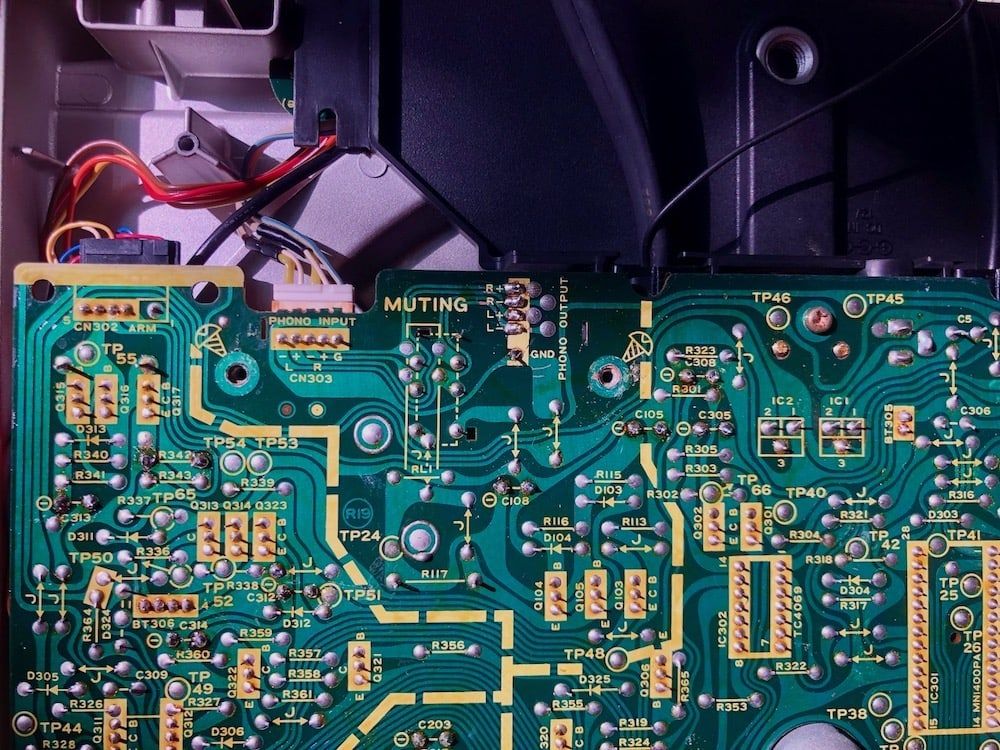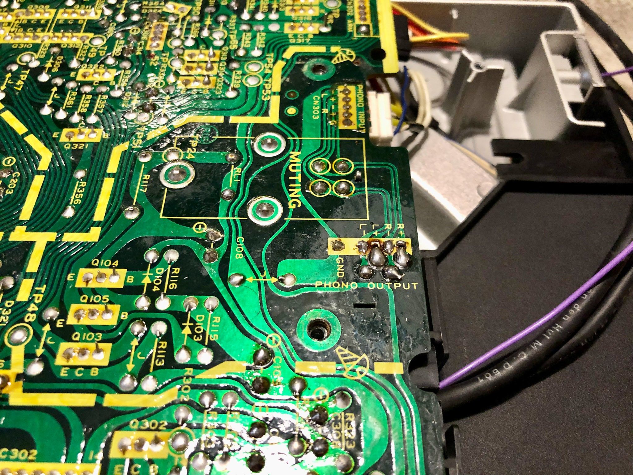 - Na het plaatsen de platenspeler weer in elkaar gezet (let op de vaste connector midden op de printplaat. ) en hij draait weer als nieuw.