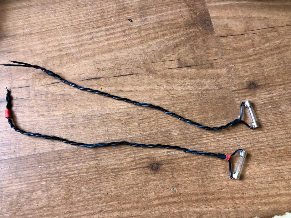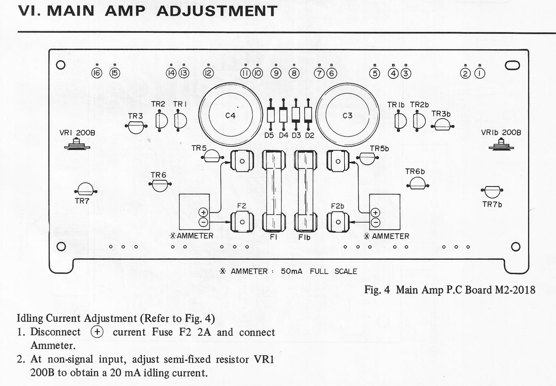 - Om de versterker goed af te regelen moet de ruststroom gemeten worden. Zoals te zien in onderstaande tekening moet daartoe de zekeringen F2a en F2b verwijderd worden en een ampere meter tussen de contacten worden aangebracht. Vanwege de beperkte ruimte heb ik een speciaal gereedschap gemaakt om dit goed en veilig te kunnen meten. Twee oude zekeringen heb ik laten doorbranden. Daarna op beide uiteinden een draad bevestigd. (zie foto). Voordeel: zonder gevaar op uitschieten en/of kortsluiting kon ik de afstelling nu rustig uitvoeren.