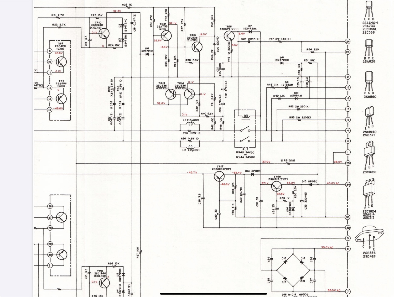 - Transistoren TR10 t/m TR16 uitgesoldeerd en nagemeten met PEAK transistortester. Hier kwamen wat minder goede waardes tevoorschijn. Tr10 en TR11 (2SC1940) vervangen.