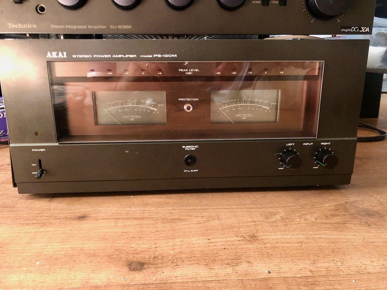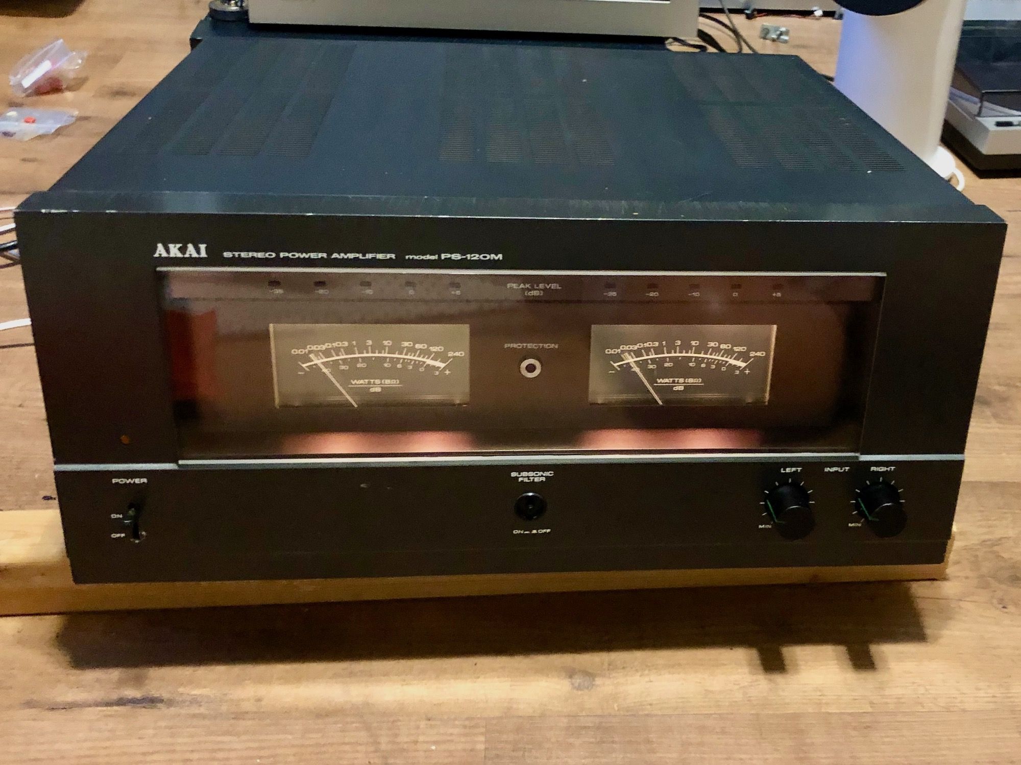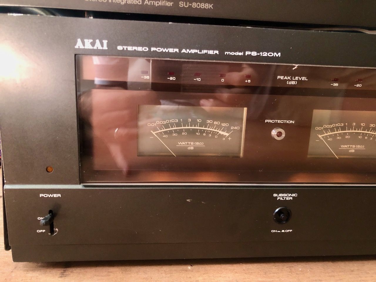 Deze Akai PS-120m is een icoon van een versterker. De twee grote VUmeters en de 5 VU l-ed's geven hem een imposant uiterlijk. Met een gewicht van 30kg is het oprecht een zware jongen te noemen.
