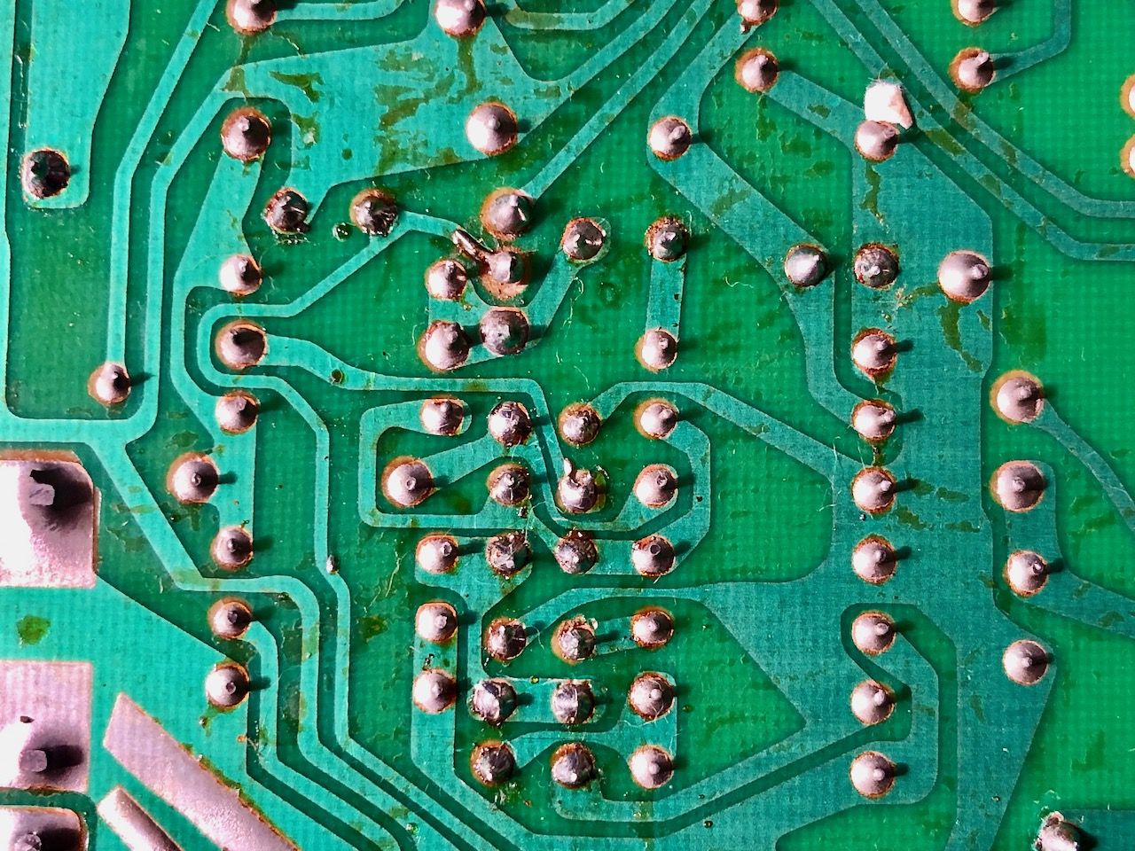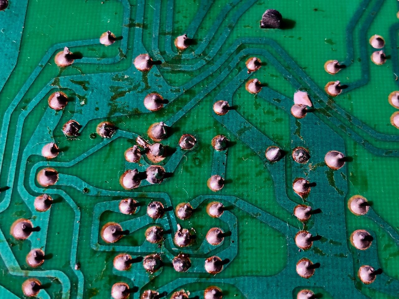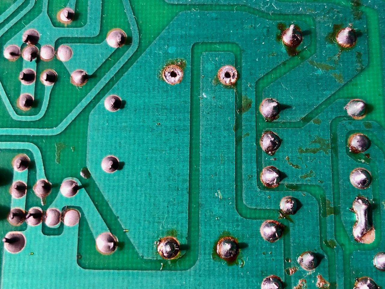 De printplaat bleek wel wat schade te hebben door eerdere reparaties. Enkele soldeerpunten waren voorzien van wat aanpassing. Deze verbindingen opnieuw gesoldeerd en nagemeten.