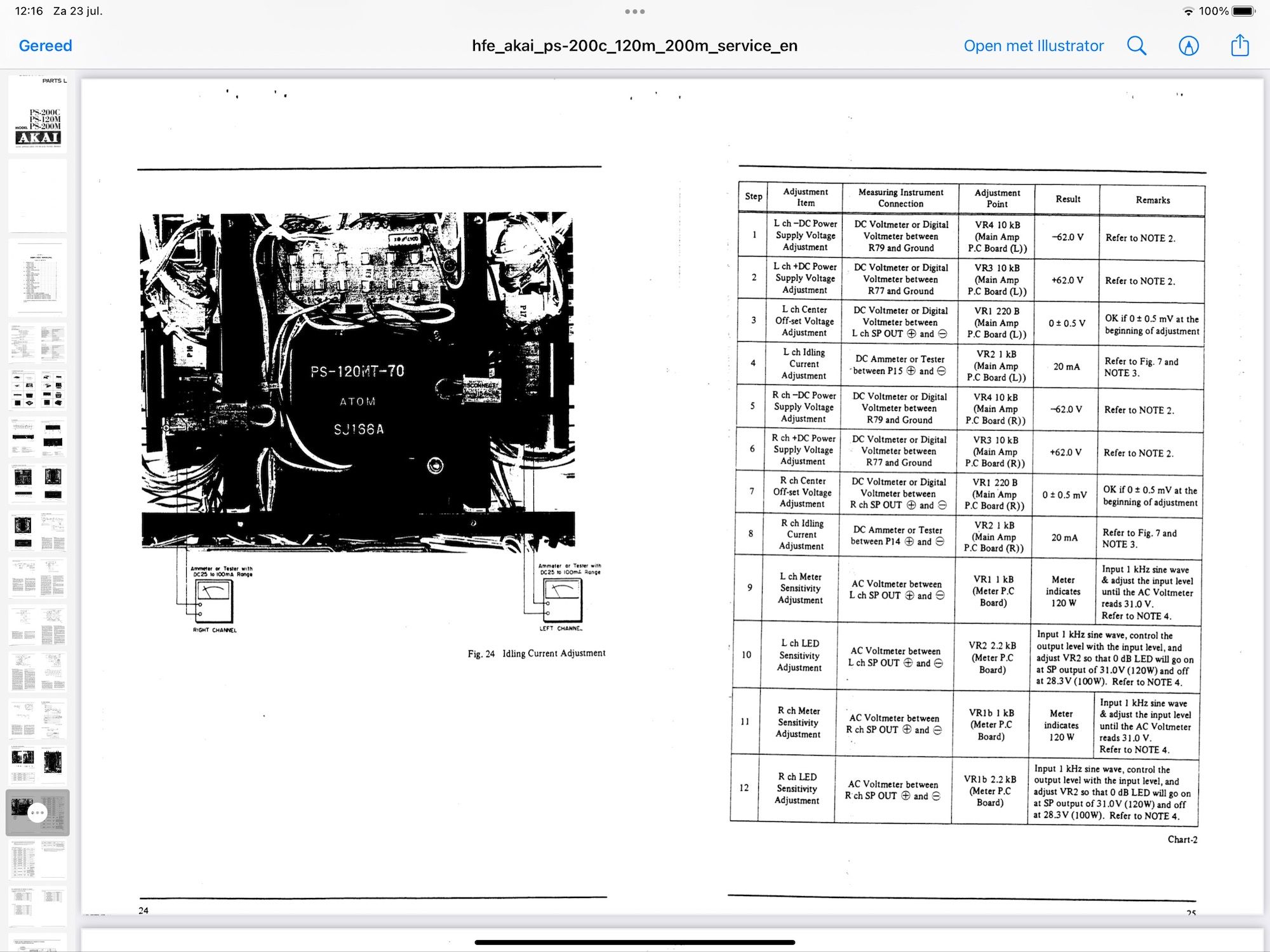 - Bias stoom, Idling current adjust: Stekker P15 verwijderen en een stroommeter tussen de twee pennen aansluiten. Met VR2 de stroom op 20mA instellen.