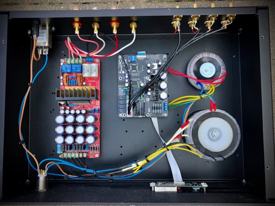 Deze PGA TA2022 klasse D versterker is een prachtige zelfbouw kit van de leverancier AUDIOPHONICS. De kit is rond 2012 aangeschaft en geheel volgens de norm opgebouwd. Opvallend is de hoge kwaliteit aan onderdelen. Een mooie voorversterker met relais gestuurde ingangsselectie. Twee hoogwaardige ringkern transformatoren en een prachtige Class D eindversterker. Deze eindversterker heeft 12 stuks 1200uF Elco’s en twee hoogwaardige MKP Condensatoren. Een goede luidsprekerbeveiliging en 90 echte Watt’s versterking.