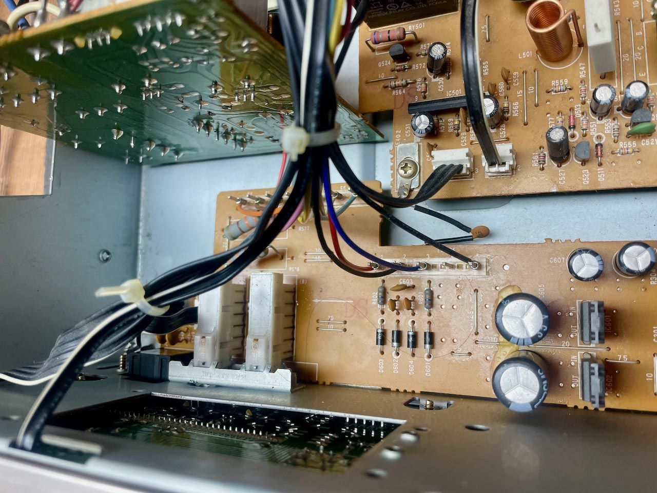Tijd voor de toongenerator en de oscilloscoop. Sinus op de CD ingang en meten maar. Na een uurtje uitzoeken was ik niks opgeschoten. Geen idee waarom het signaal dus wel direct wordt doorgegeven maar niet via de tooninstellingen. Ineens zie ik in mijn ooghoek een tweetal stekkertjes liggen. Deze zaten op de achterkant van de versterker en zorgen voor de doorvoer van….. ja het signaal naar de tooninstelling. Grrrrrrrr.