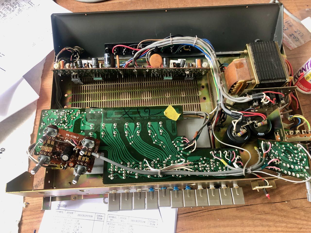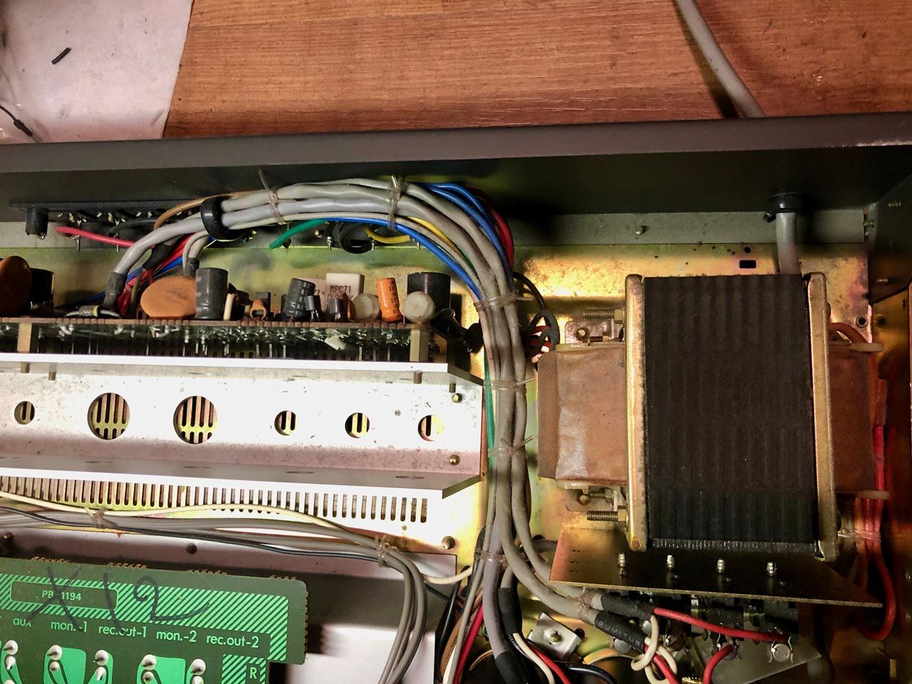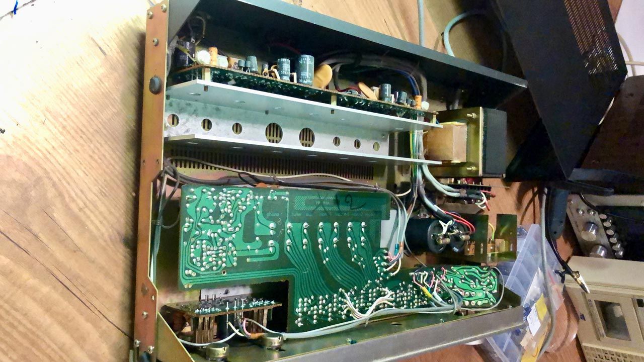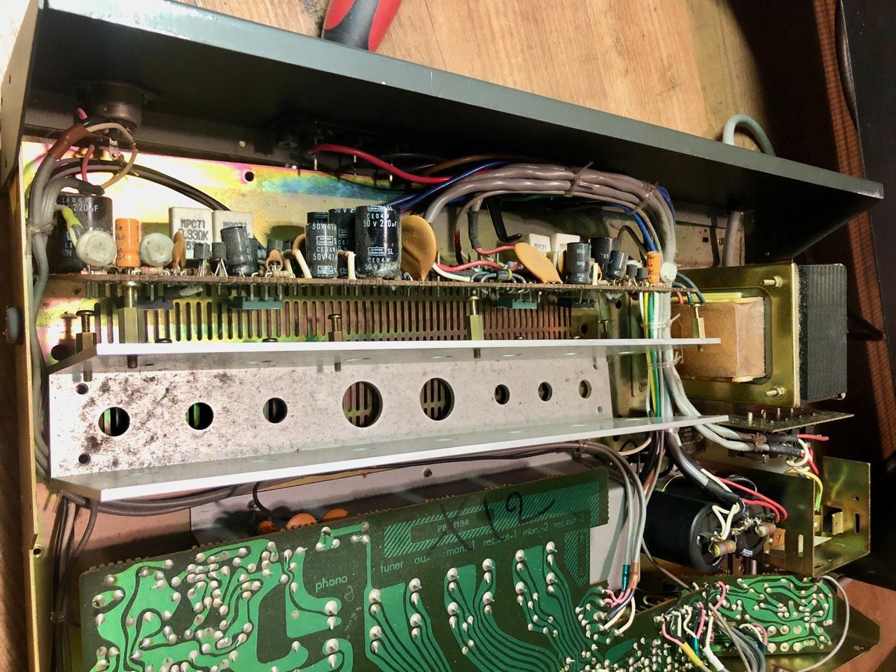 De versterker ontdaan van zijn stevige kap (ook weer anders dan 99% van de audio apparatuur) en een blik geworpen onder de motorkap. Een mooie en duidelijke opbouw. Veel stof! De condensatoren zien er nog allemaal goed uit.