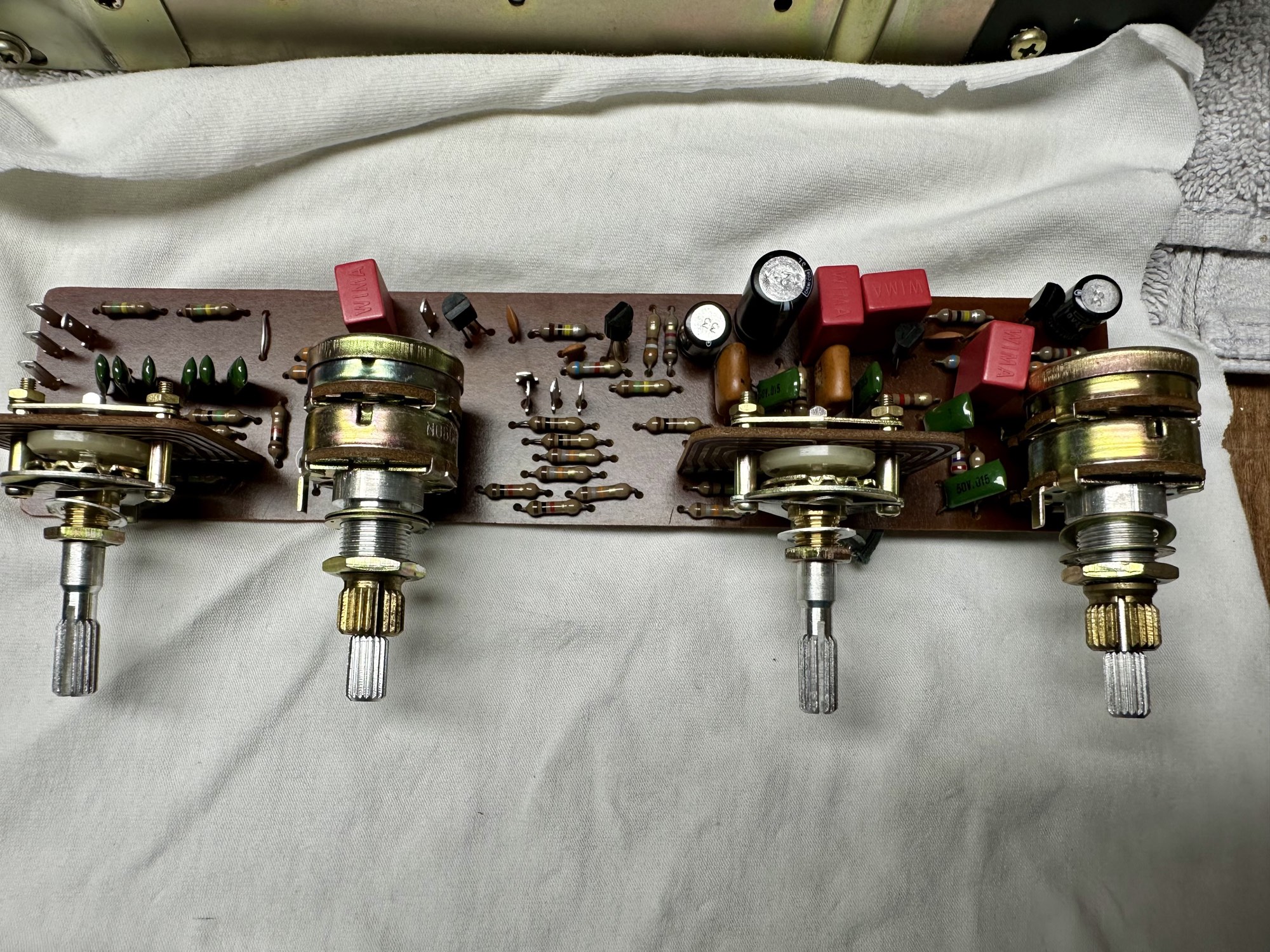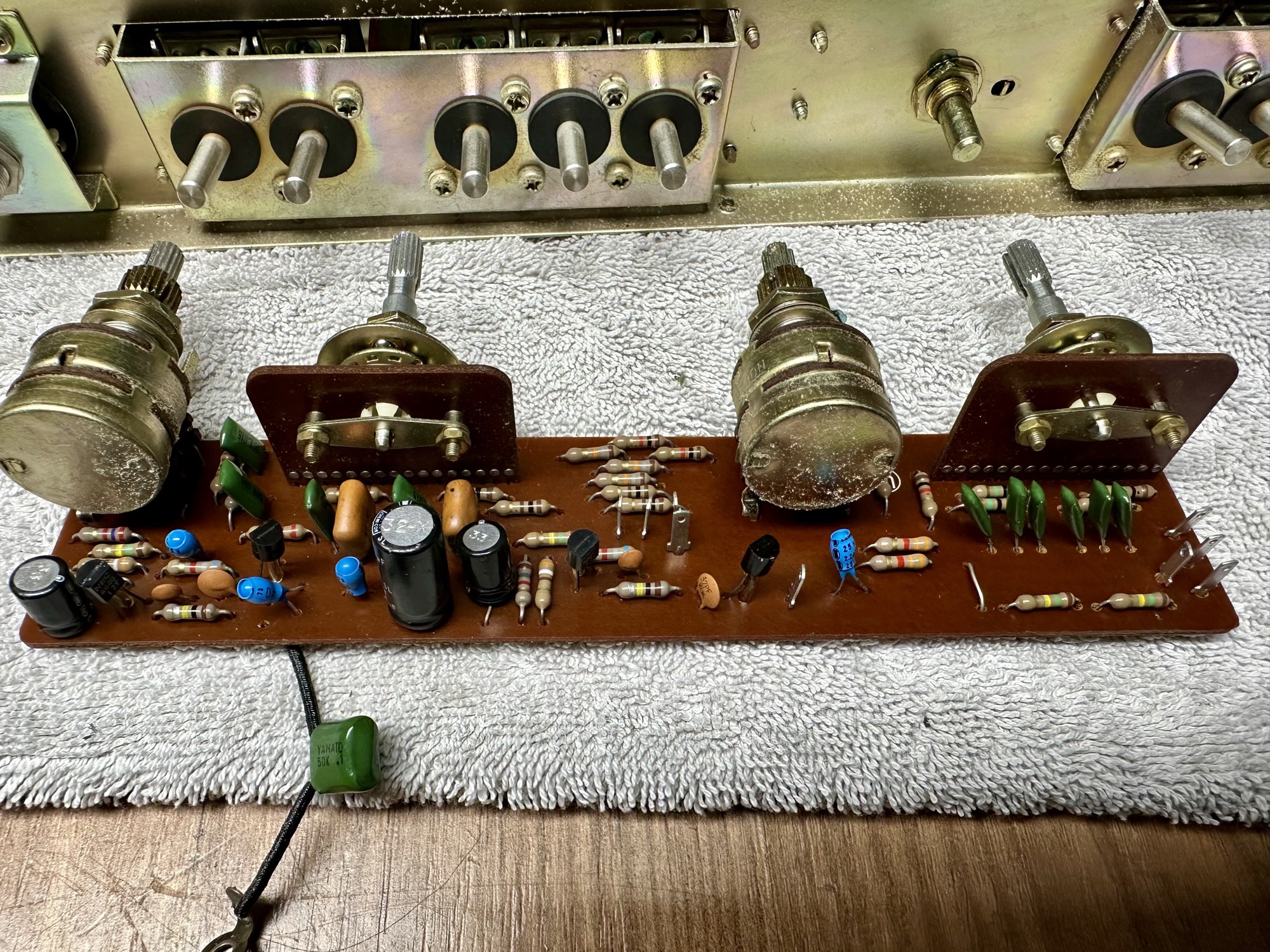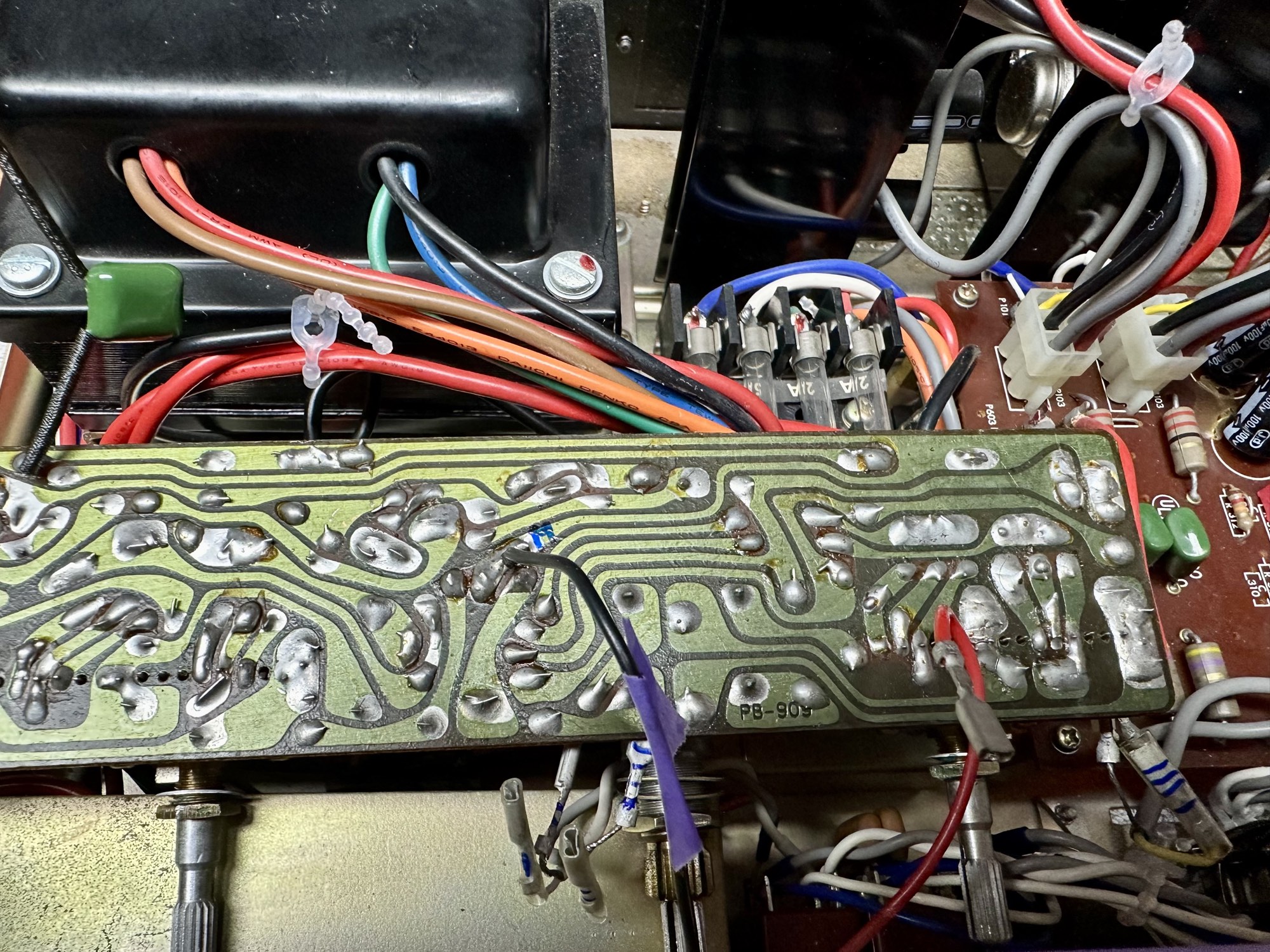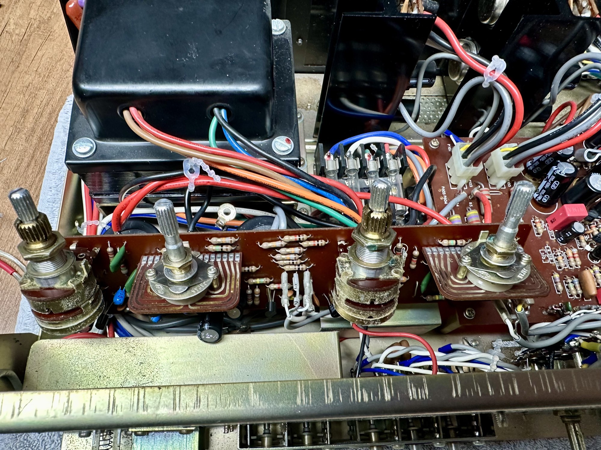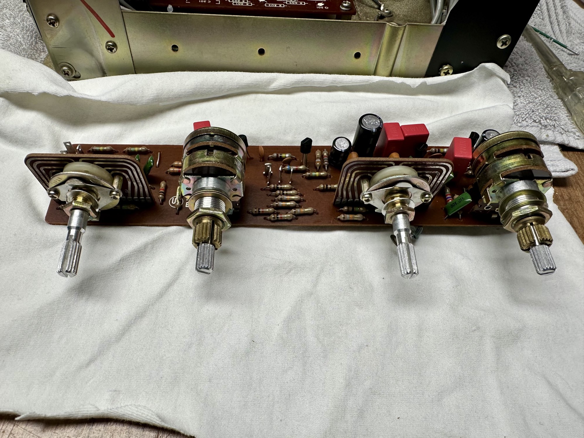 - De schakelaars en potmeters zijn erg vies. De toonregeling print daarom uitgesoldeerd om ultrasoon gereiniugd te worden.