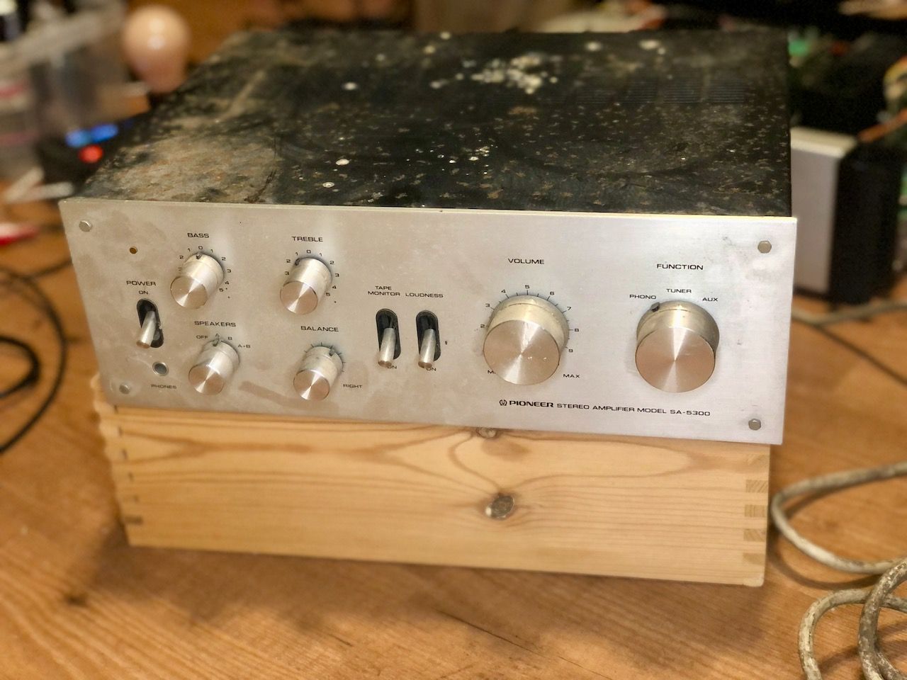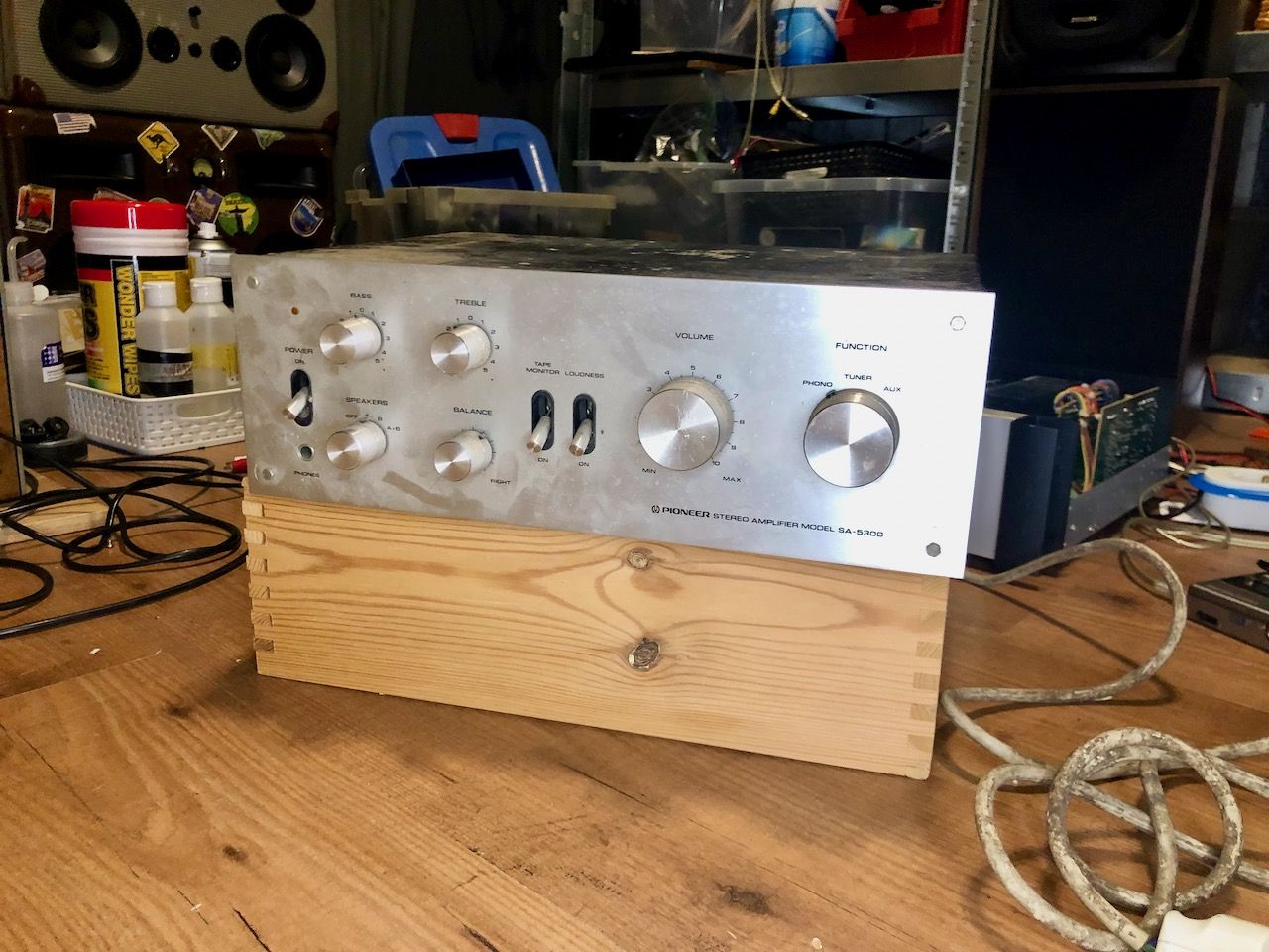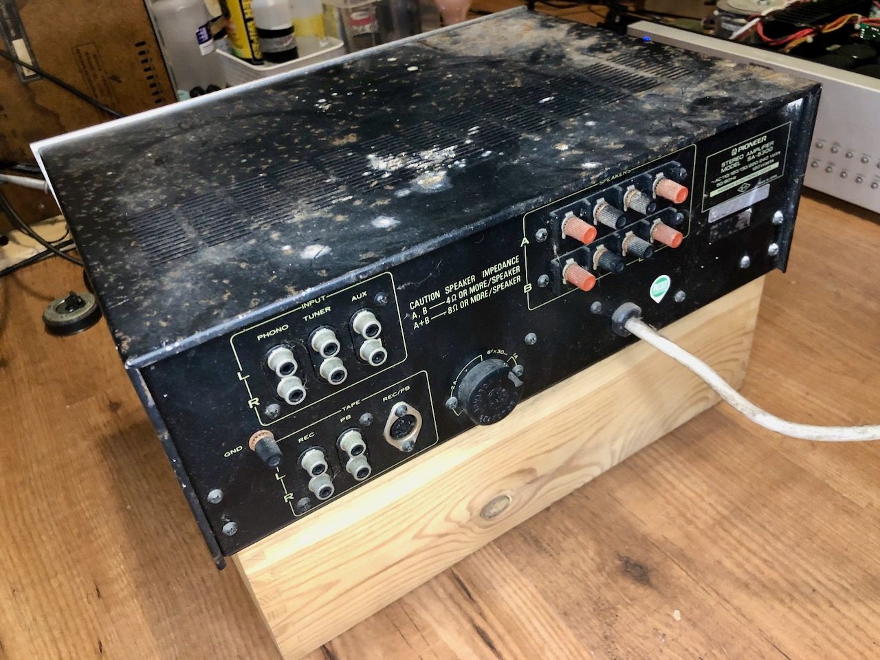 Na jaren in een schuur te hebben gestaan kwam deze zwaar verwaarloosde Pioneer SA-5300 versterker bij mij aan. Na een eerste reiniging kwam er een mooie versterker tevoorschijn. Gezien zijn leeftijd en verwaarlozing is de electronica toch nog in prima conditie.