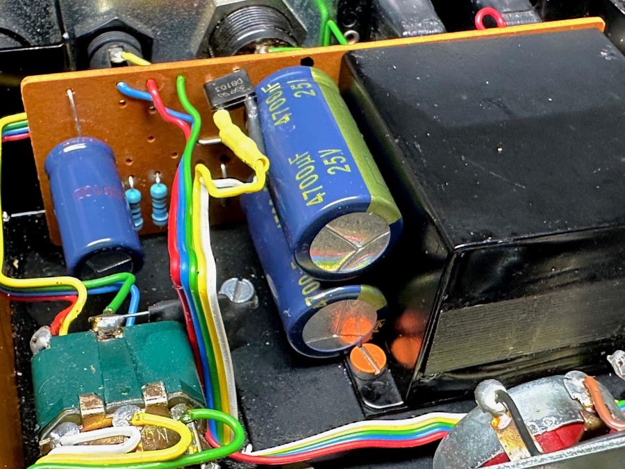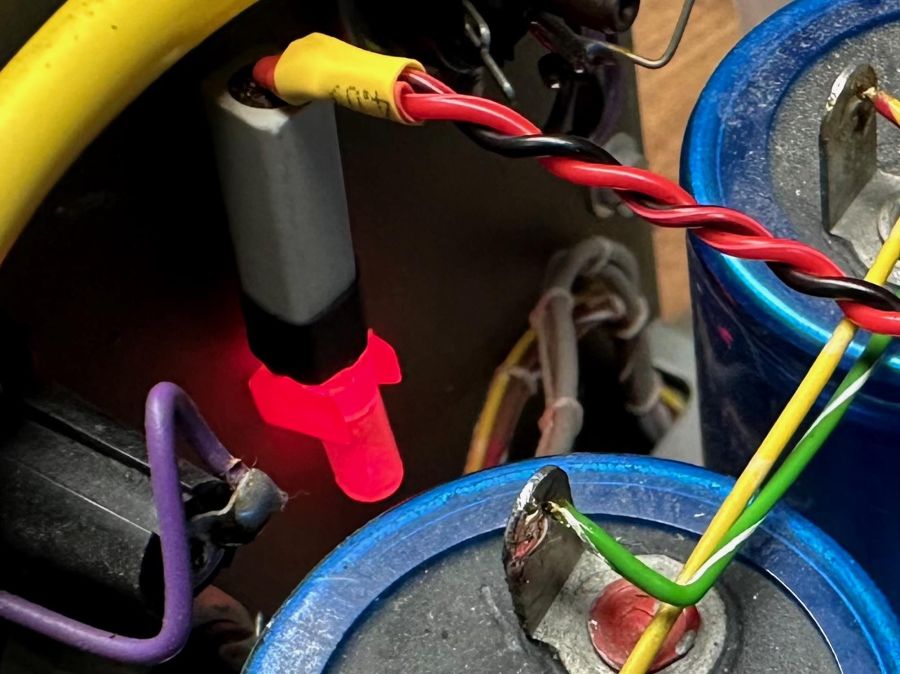 De vier dikke kanonnen van condensatoren zijn in het verleden al vervangen en meten nog prima. Tenzij de luistertest anders uitpakt hoeven deze niet vervangen te worden. De ledverlichting was nog even testen maar is mooi geworden. De Led heeft een hoedje gekregen van kunststof (het dopje wat over de naald van een spuit gaat. Beetje recyclen kan geen kwaad toch?) om beter in de originele houder te passen.