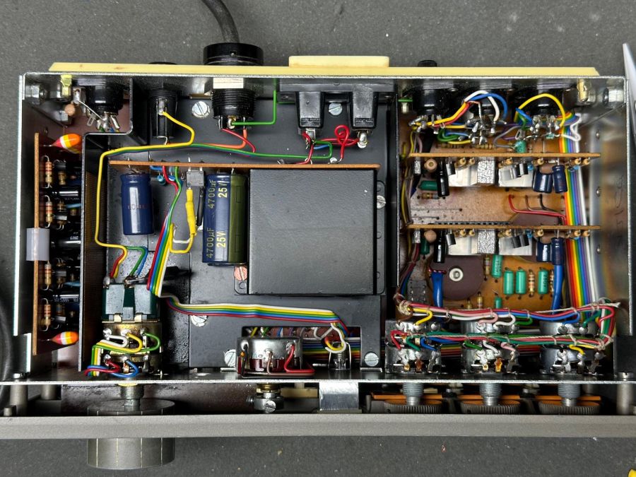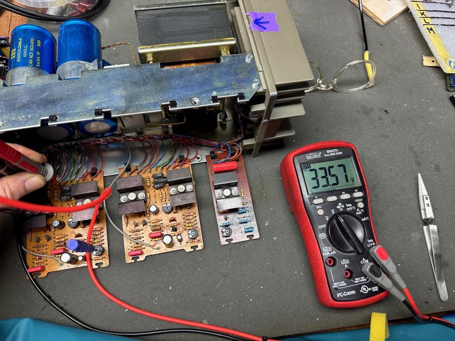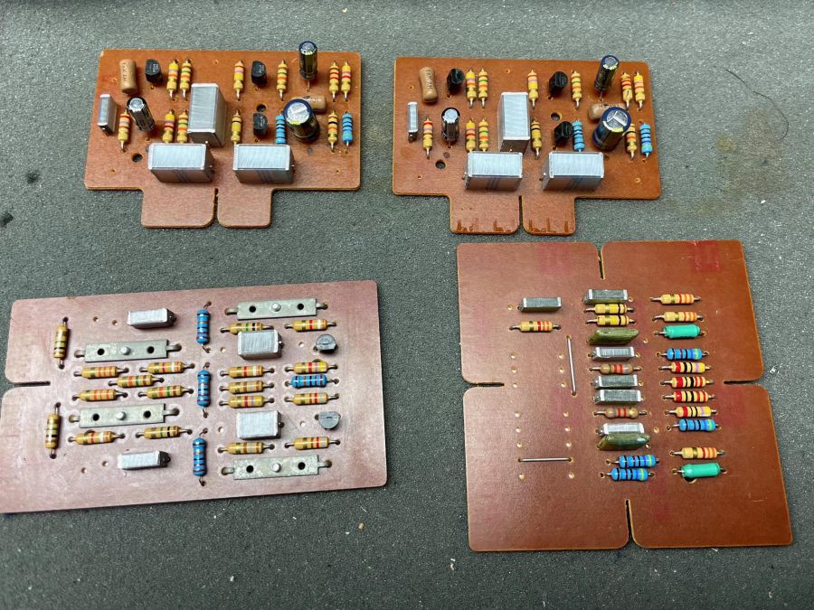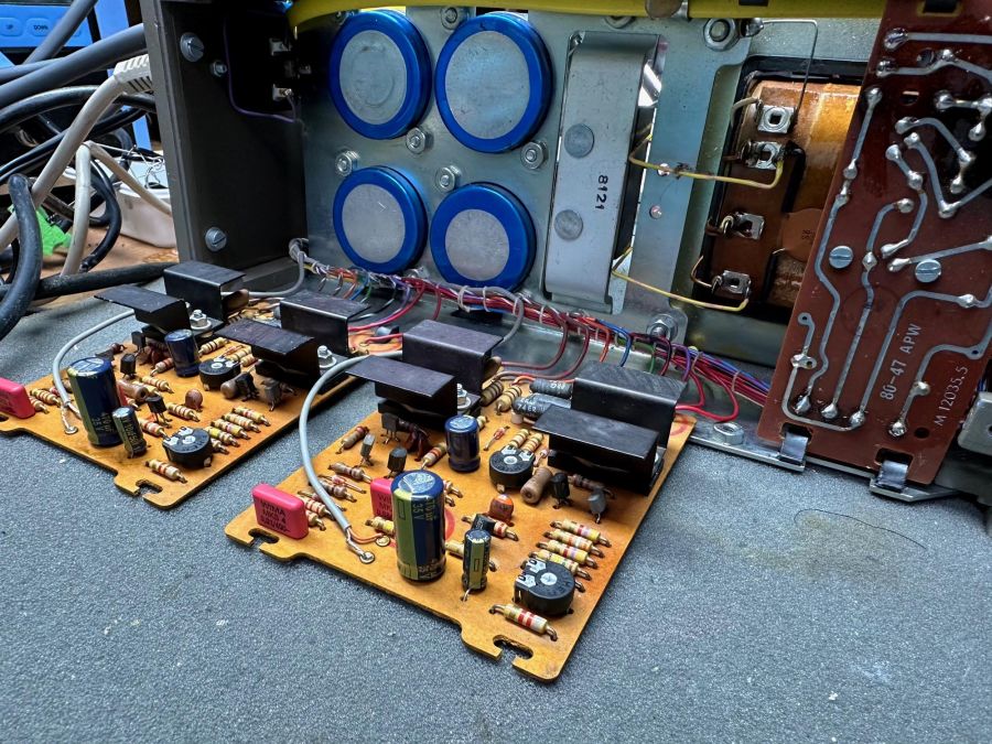Dan door naar de versterker boards. Vreemd genoeg is hier ooit voor een diversiteit aan condensatoren gekozen. Deze dus zowel voor links als rechts gelijkgetrokken. Nieuwe instelpotmeters erop, de boel afregelen op 67 volt en 33,5 volt en gaan met die banaan.