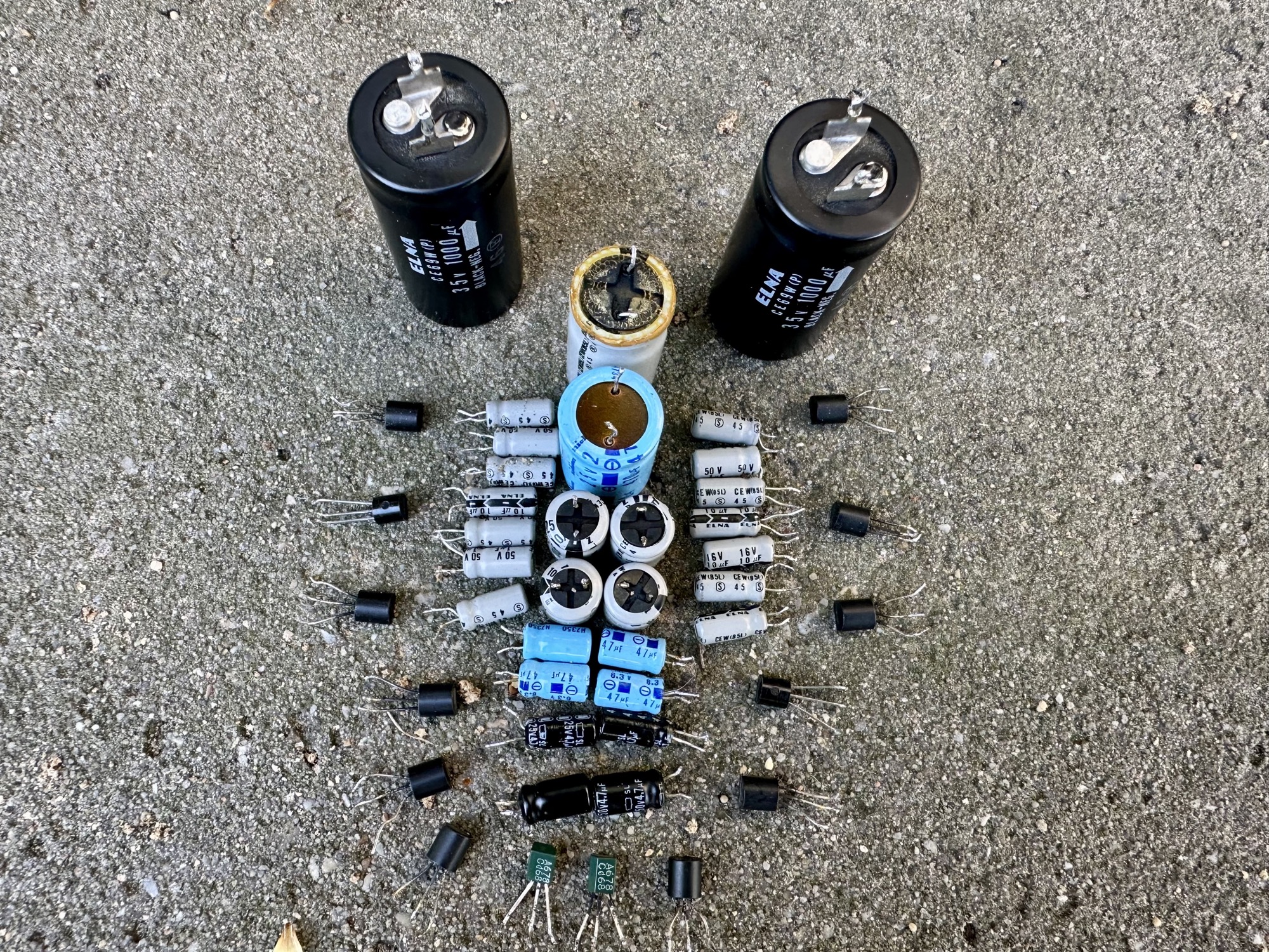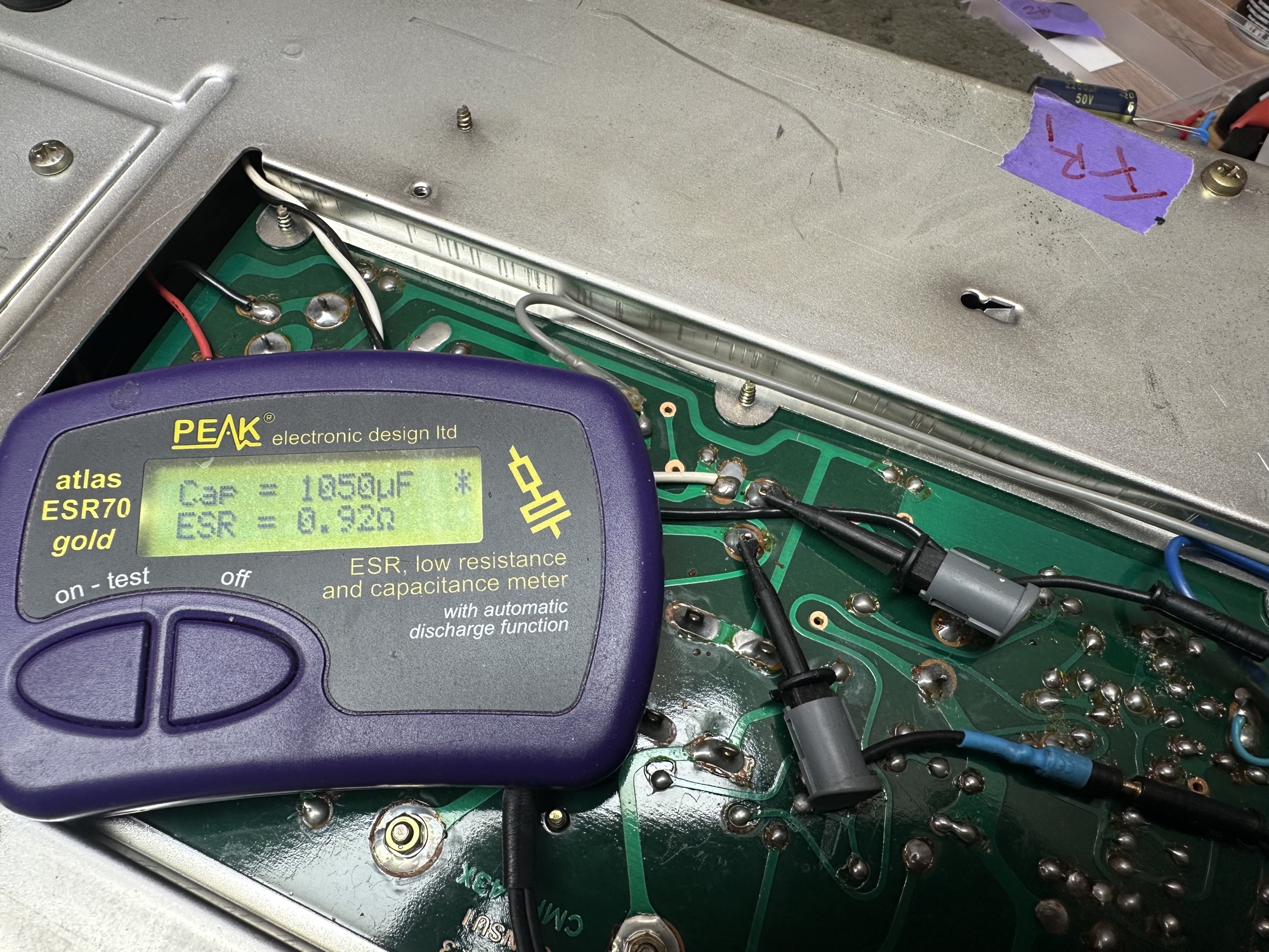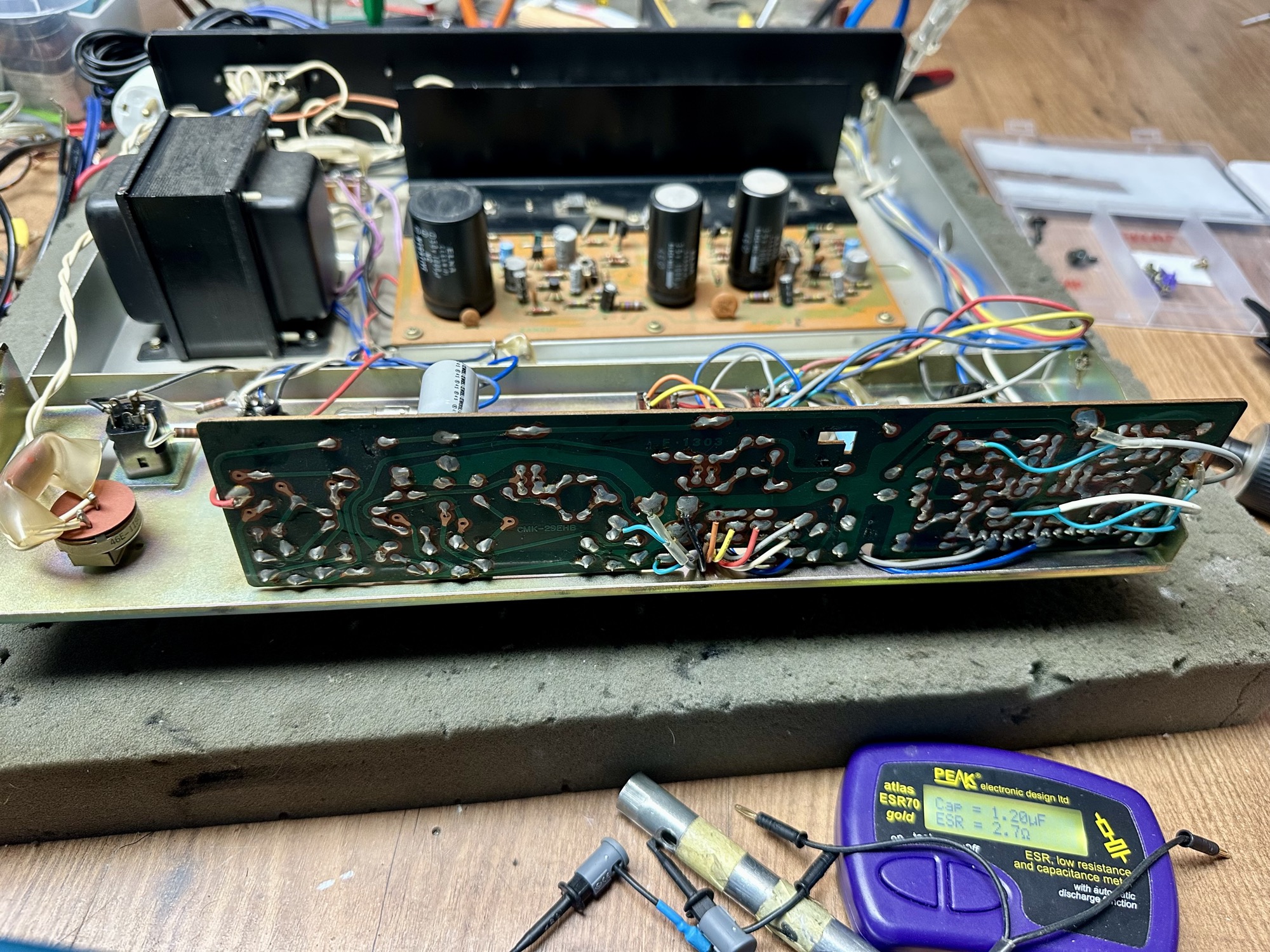 - De 1000uF buffer elco voor de voeding bewust niet vervangen. Deze had nog prima meetwaardes en vervanging door een hogere waarde zou alleen maar voor problemen kunnen zorgen. Het is een kleine versterker met een kleine transformator.