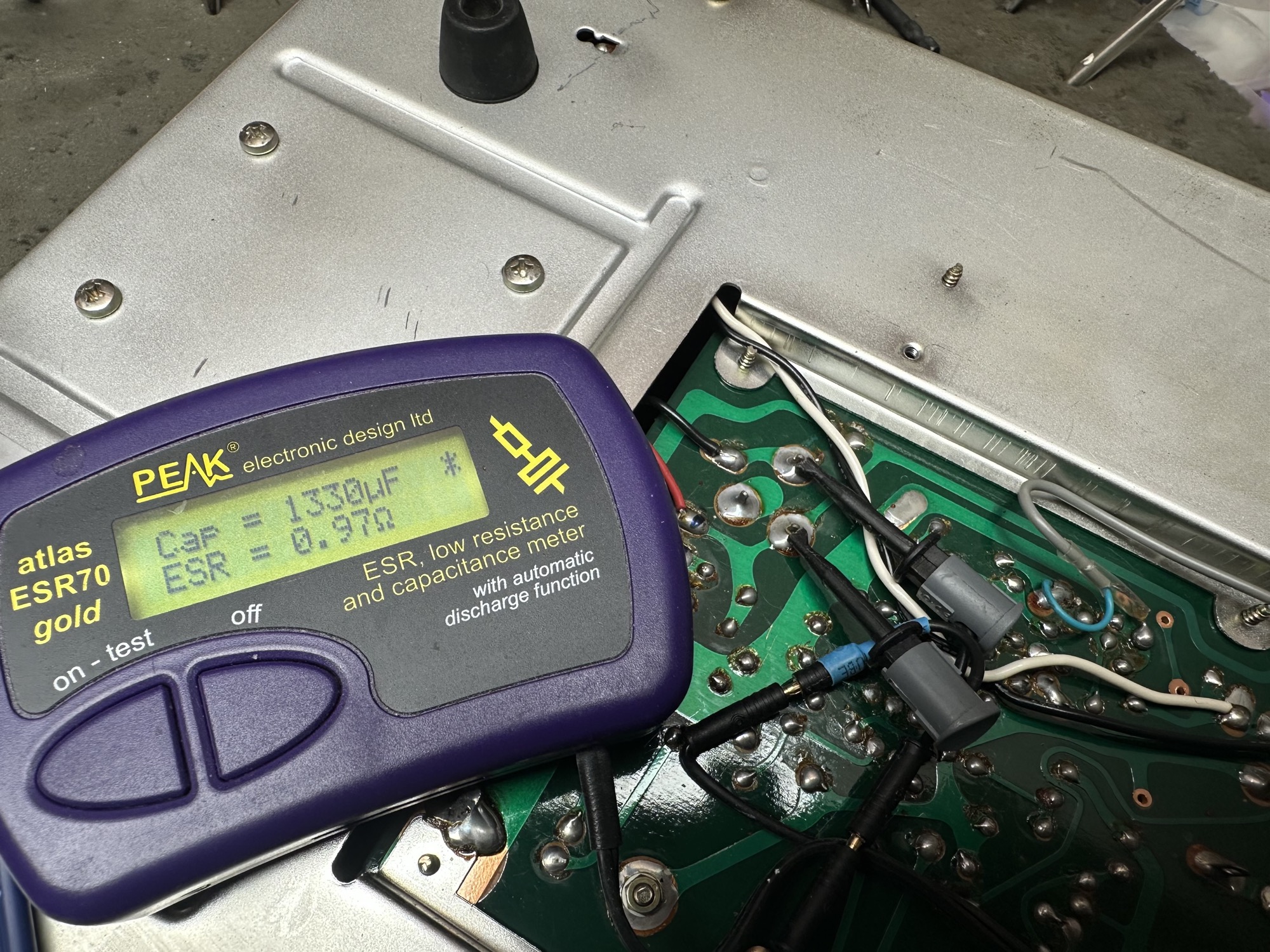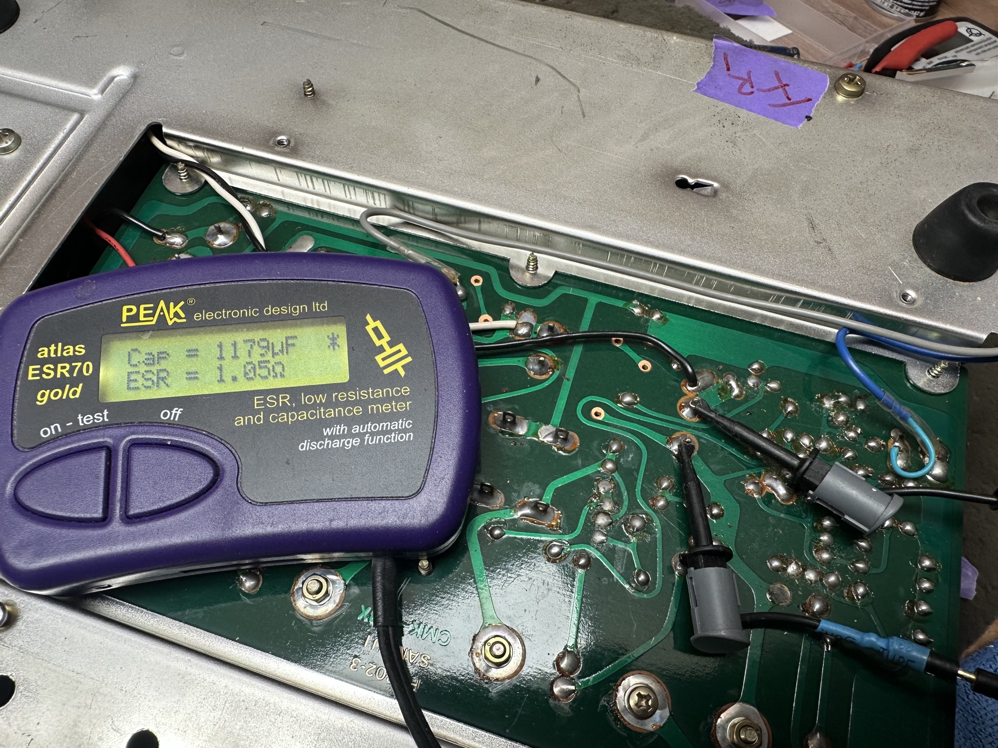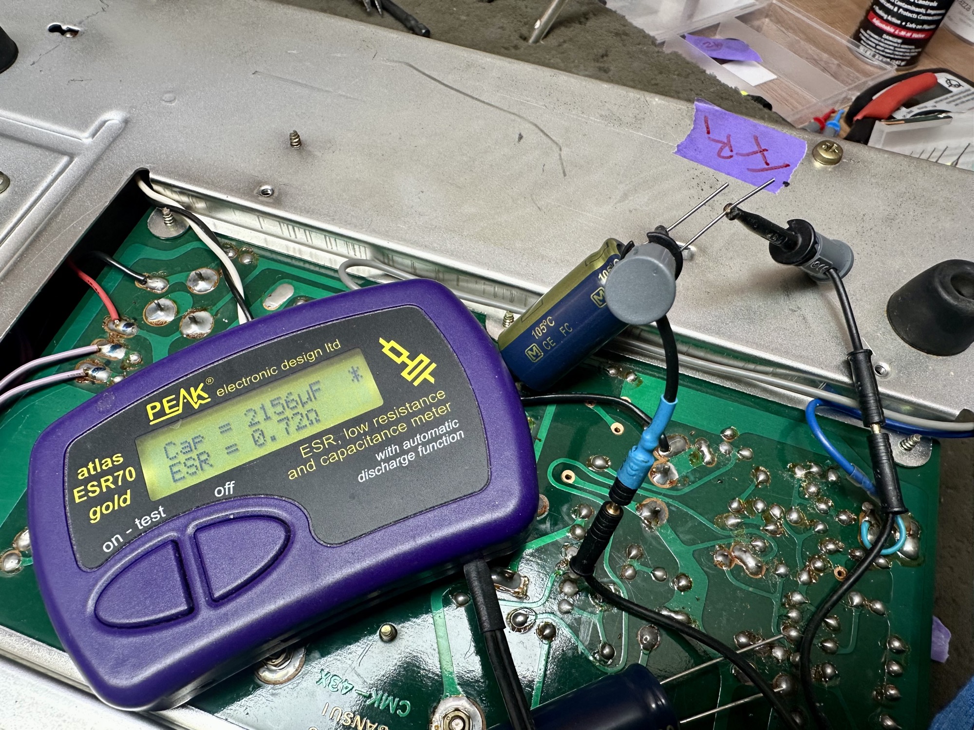 - De 1000uF buffer elco voor de voeding bewust niet vervangen. Deze had nog prima meetwaardes en vervanging door een hogere waarde zou alleen maar voor problemen kunnen zorgen. Het is een kleine versterker met een kleine transformator.