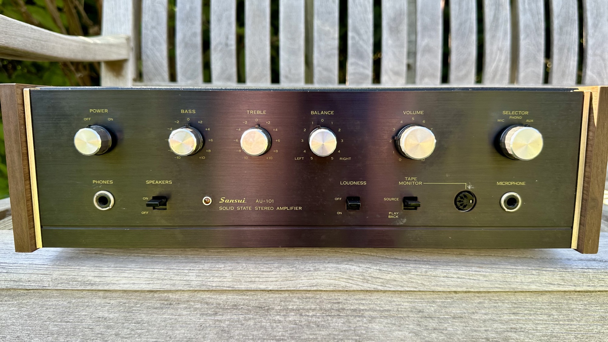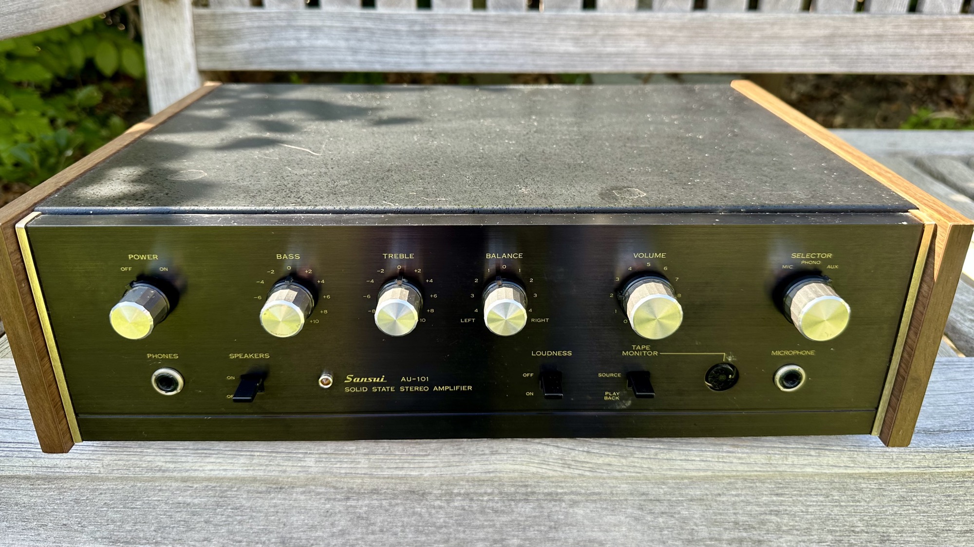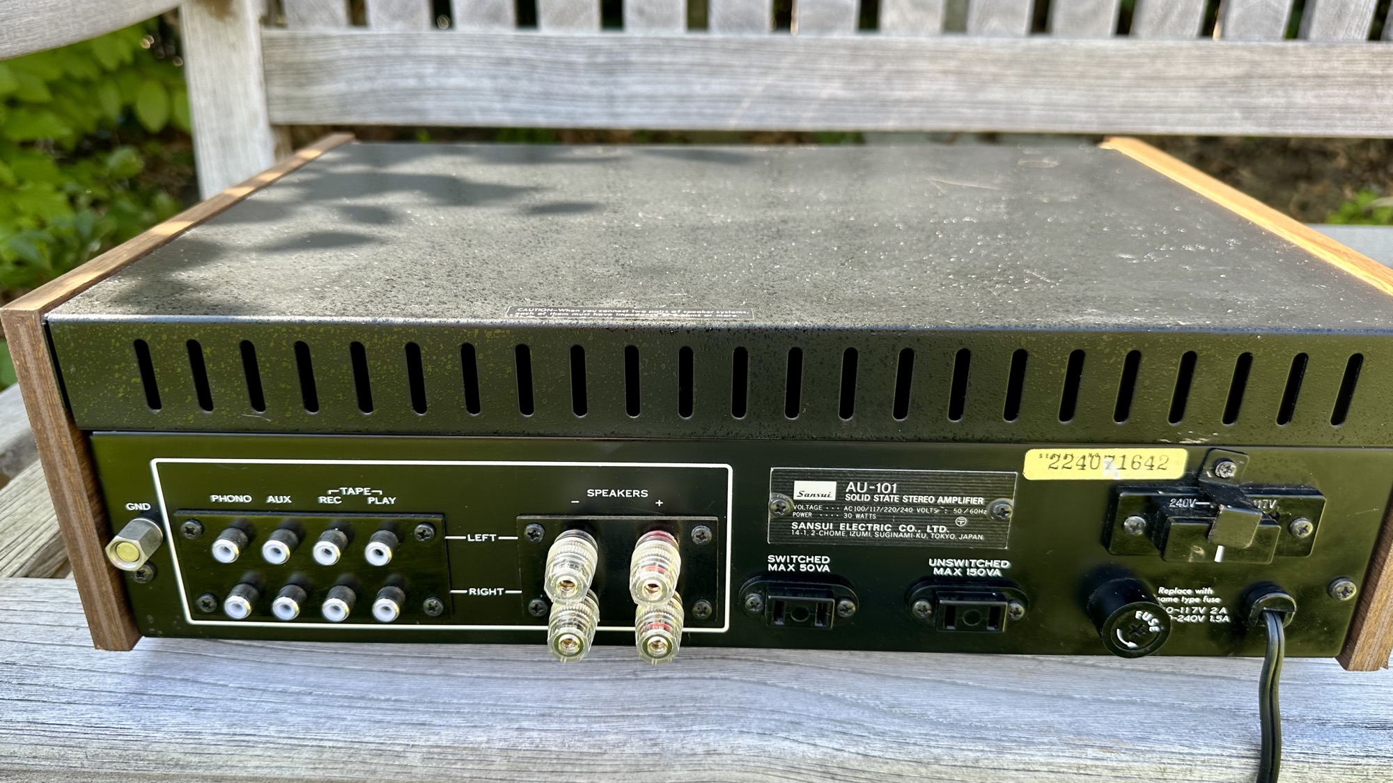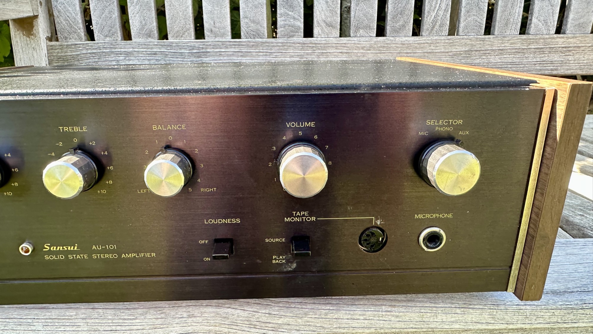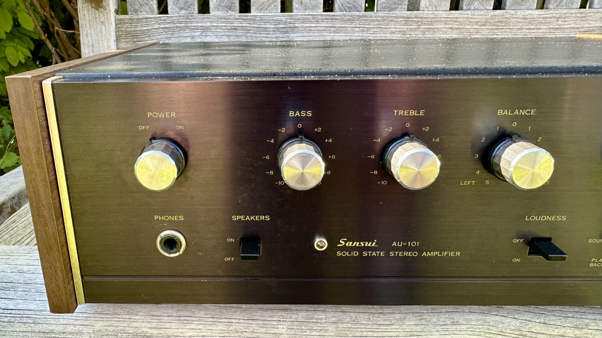 En daar staat weer een Sansui AU-101 versterker ter reparatie. Zijn prachtige houten Sides en strakke zwarte front en kap staan hem goed. Hij oogt als een jonge krachtpatser. Til je deze geweldenaar op dan verraad hij direct zijn vermogen. Met zijn zeer bescheiden gewicht en relatief lege binnenkant zou je je zomaar kunnen vergissen in zijn potentie. Want... man, man, man, wat klinkt deze kleine Sansui toch waanzinnig goed. Op aangenaam luisterniveau, waarbij je je buren zeker te vriend zal houden, komt zijn ware aard naar boven. Een heerlijk strak en ruimschoots aanwezig laag, een helder midden en een (zeker voor zijn tijd) aanwezig hoog. Alles netjes in balans en een lust om naar te luisteren.