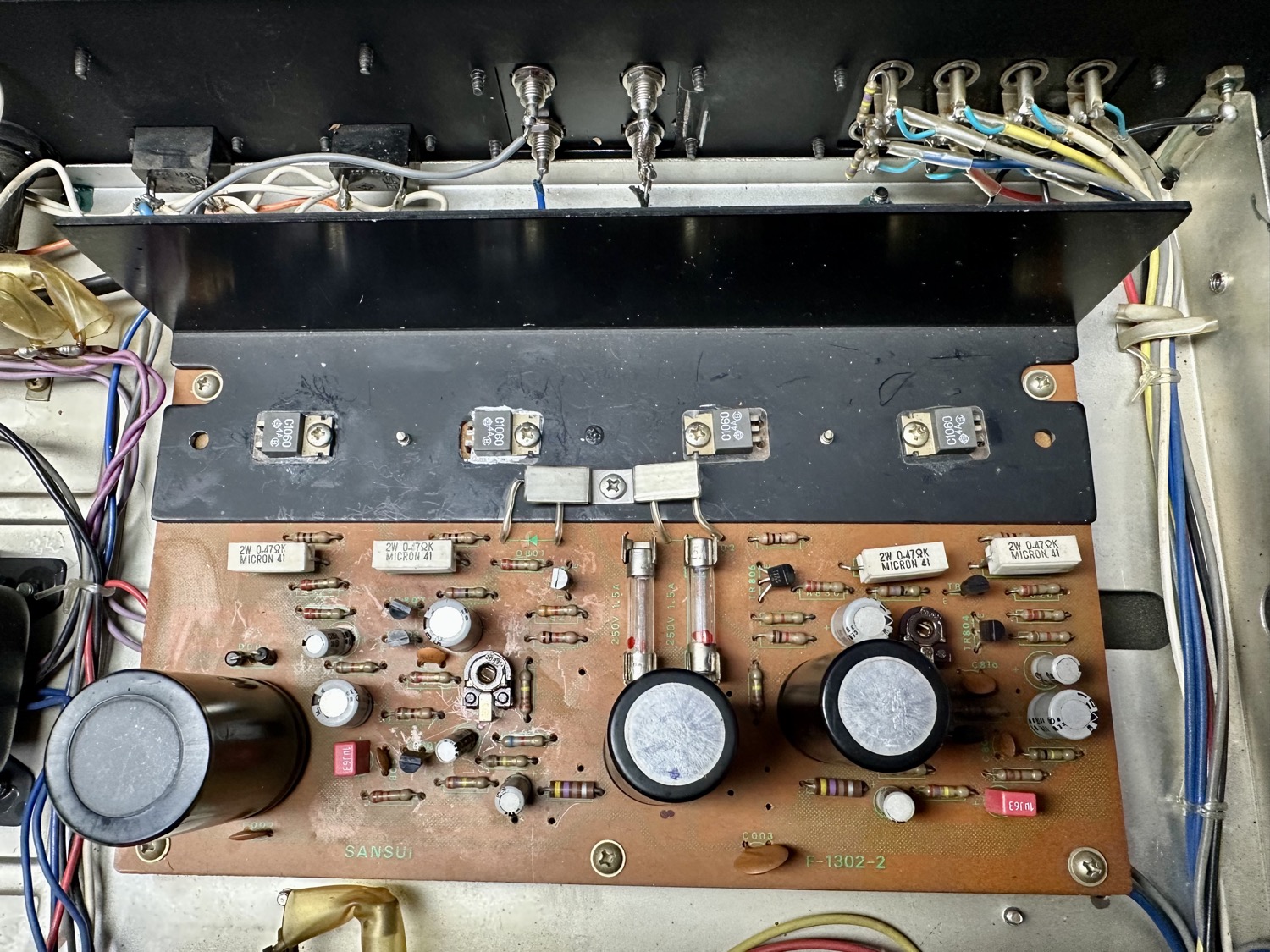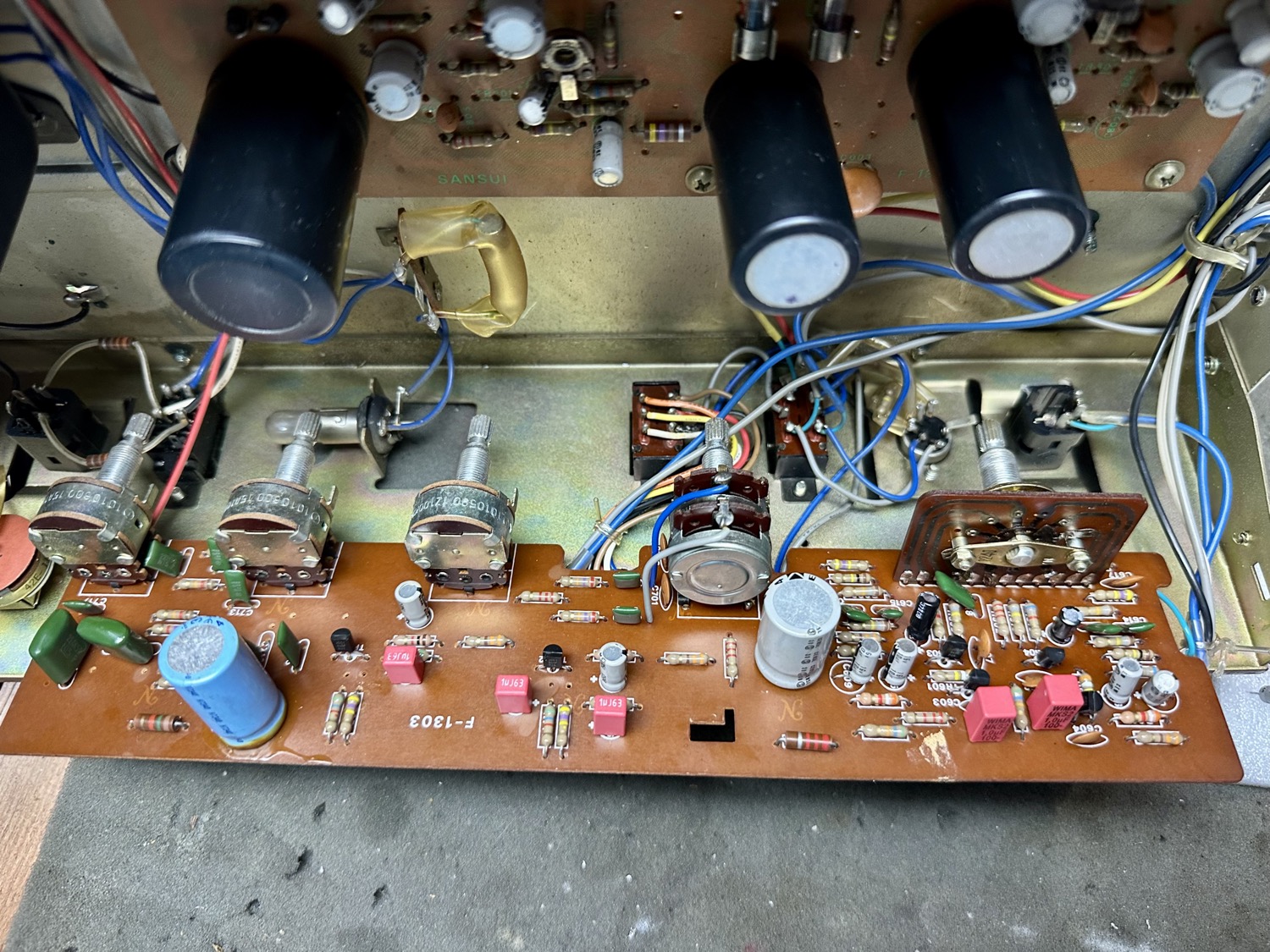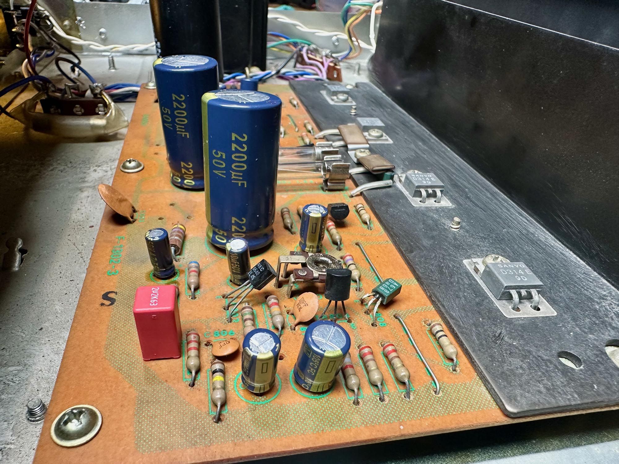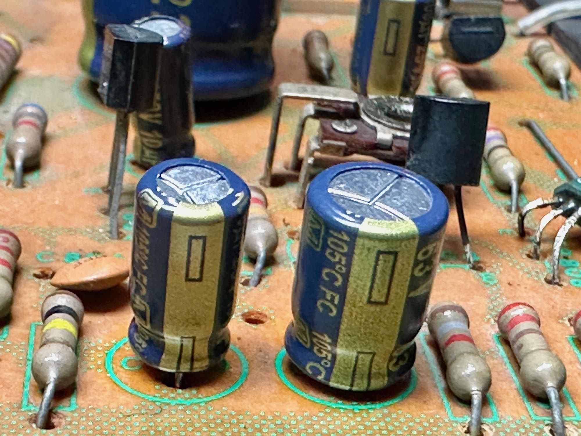 Na 50 jaar is het niet vreemd dat de condensatoren niet meer in topconditie zijn. Wat mij opvalt aan oude versterkers is de hoge kwaliteit van de toen gebruikte condensatoren. Vele geven nog steeds mooie meetwaarden. Maar… net zo gemakkelijk kan er eentje defect zijn. Aan de buitenkant zie je hier niks van maar bij meting wordt dit duidelijk. Zo ook bij deze Sansui versterker. Een 100uF elco bleek een waarde te hebben van nog geen 1uF. Zijn broertje van het linkerkanaal is meet nog perfect. De koppelcondensatoren hebben stuk voor stuk een erg hoge ESR wat een goede weergave in de weg staat. Ook hun capaciteit bleek niet meer binnen de norm.