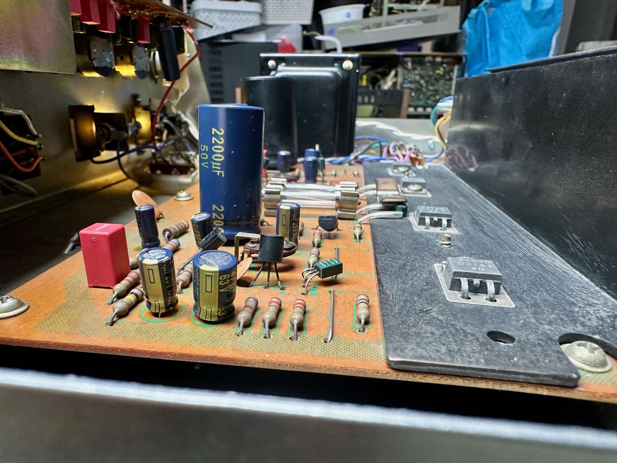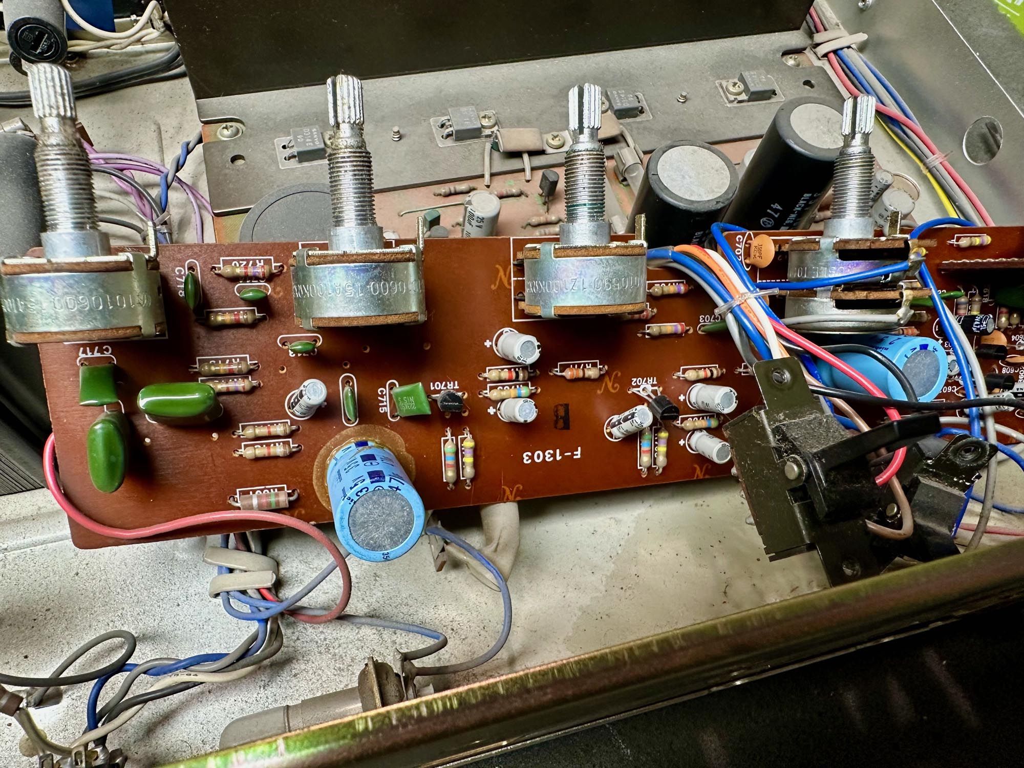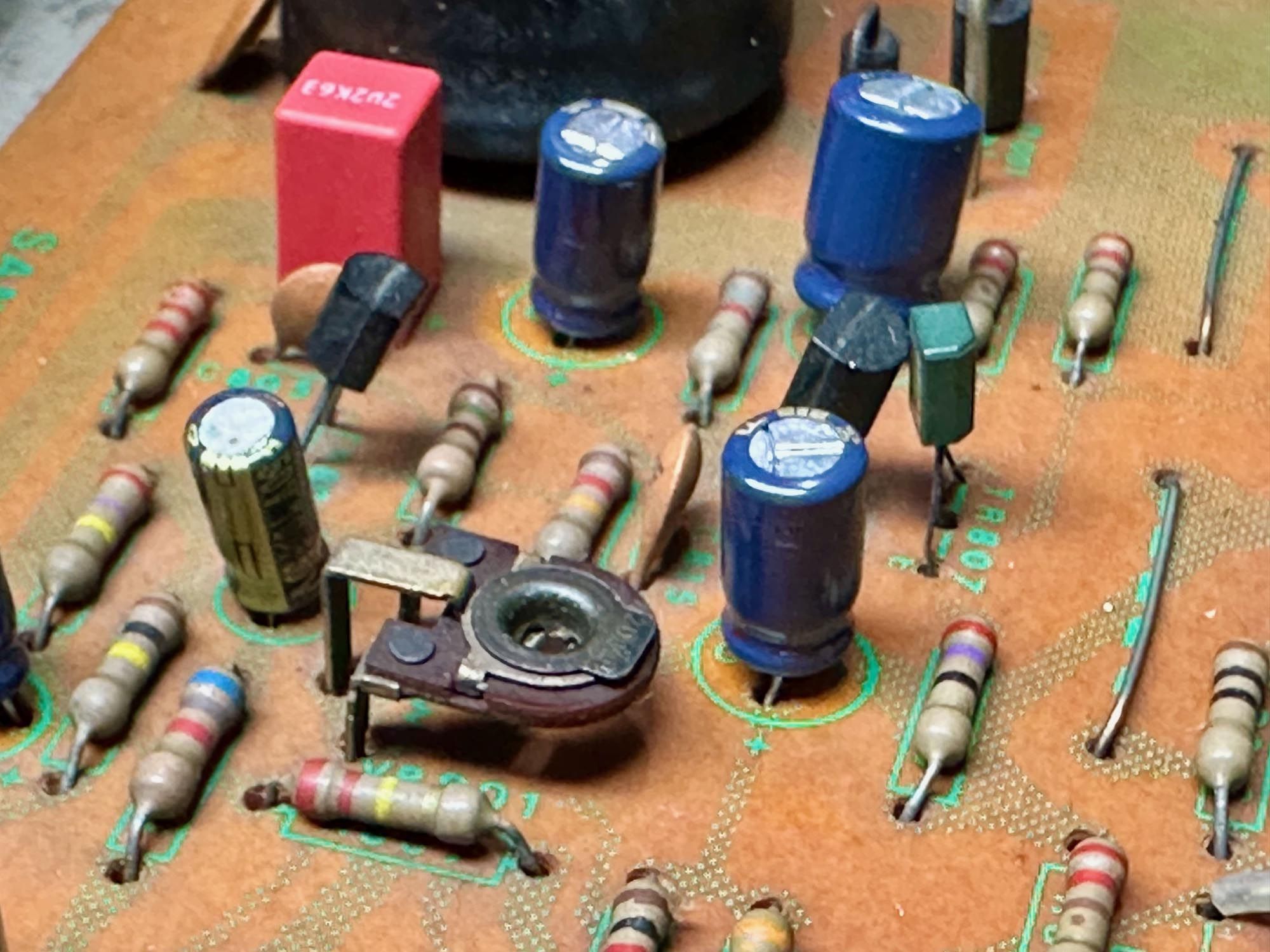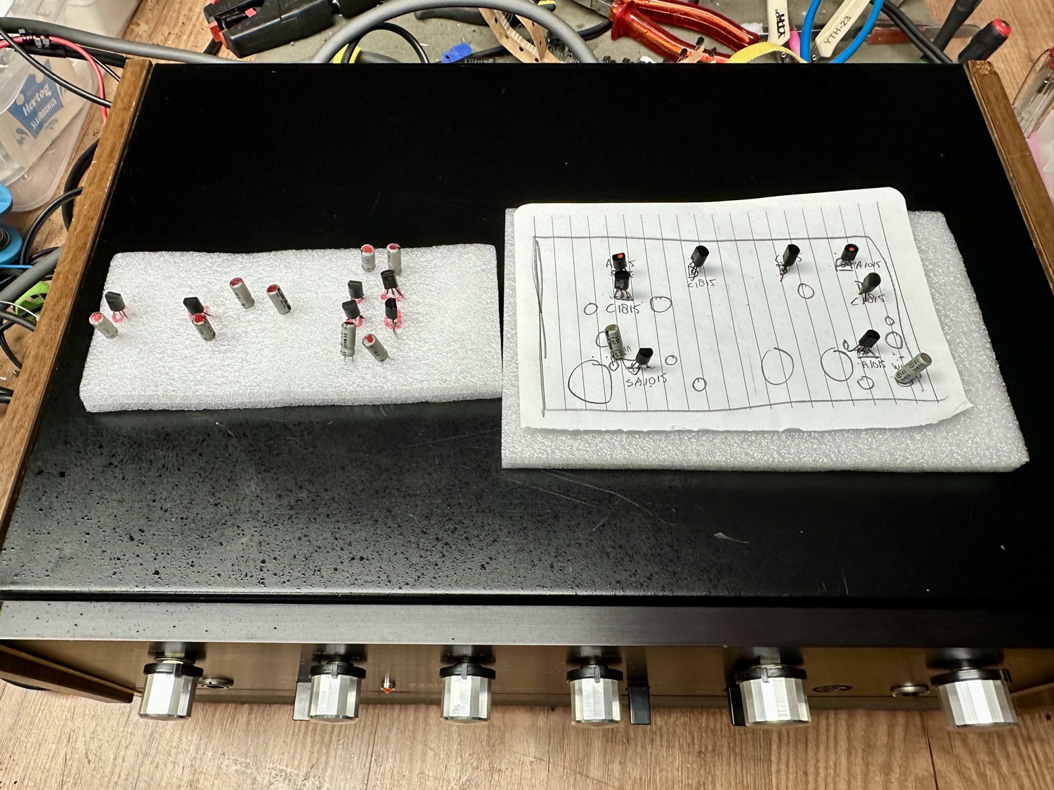 Na 50 jaar is het niet vreemd dat de condensatoren niet meer in topconditie zijn. Wat mij opvalt aan oude versterkers is de hoge kwaliteit van de toen gebruikte condensatoren. Vele geven nog steeds mooie meetwaarden. Maar… net zo gemakkelijk kan er eentje defect zijn. Aan de buitenkant zie je hier niks van maar bij meting wordt dit duidelijk. Zo ook bij deze Sansui versterker. Een 100uF elco bleek een waarde te hebben van nog geen 1uF. Zijn broertje van het linkerkanaal is meet nog perfect. De koppelcondensatoren hebben stuk voor stuk een erg hoge ESR wat een goede weergave in de weg staat. Ook hun capaciteit bleek niet meer binnen de norm.