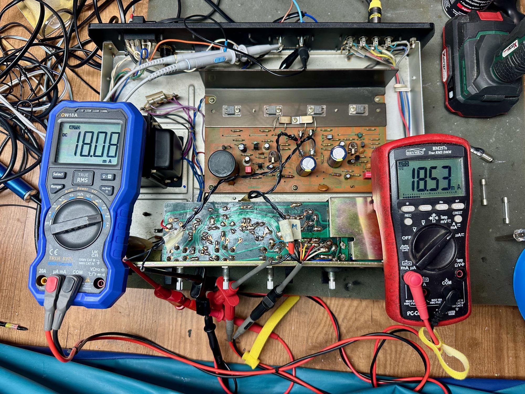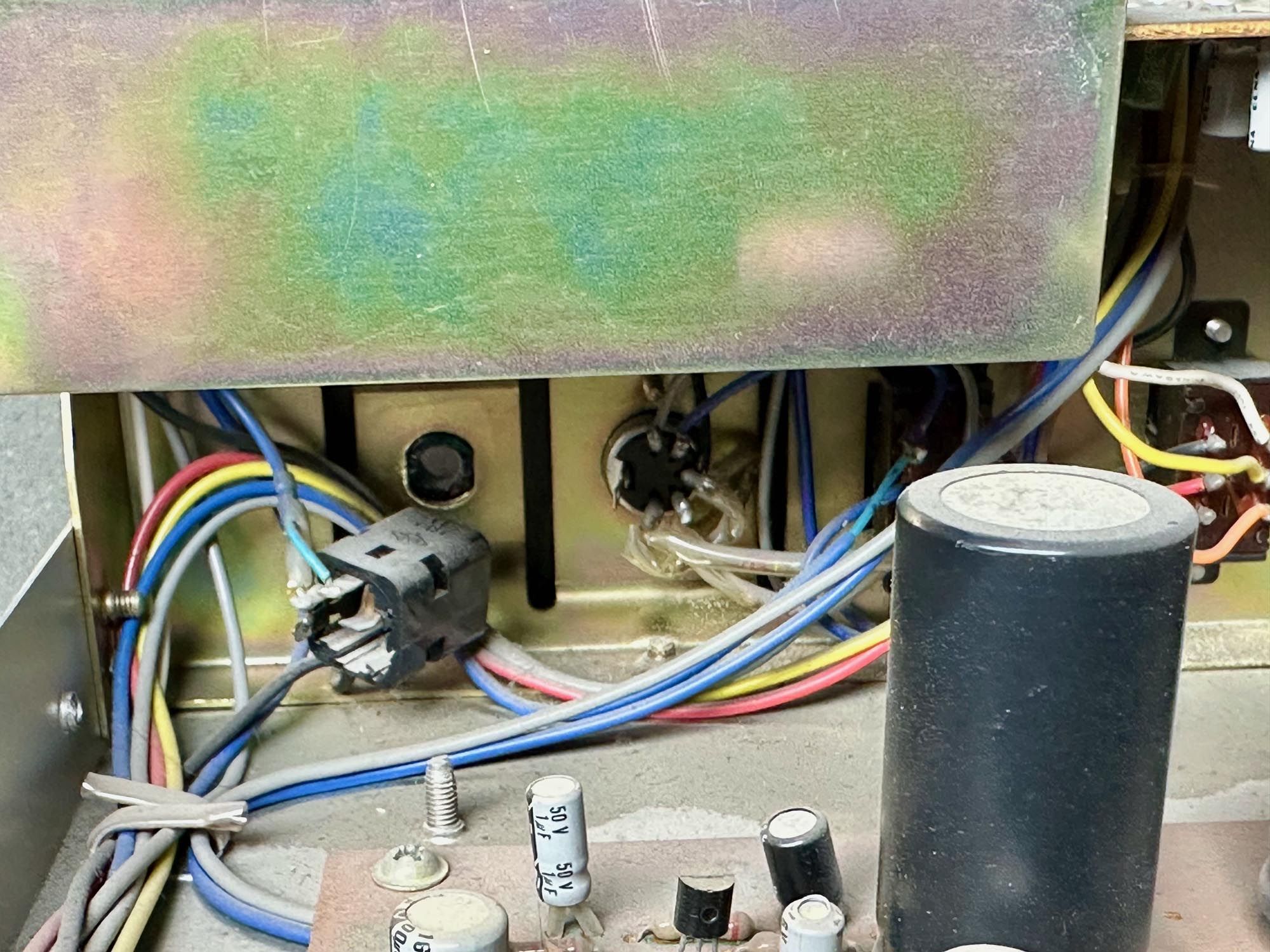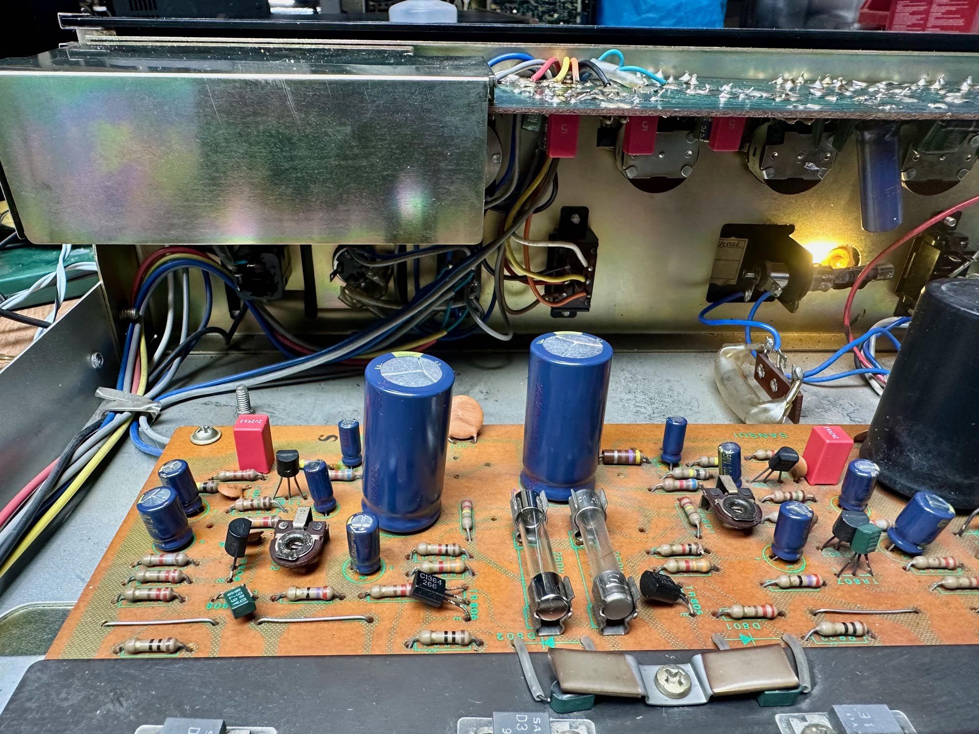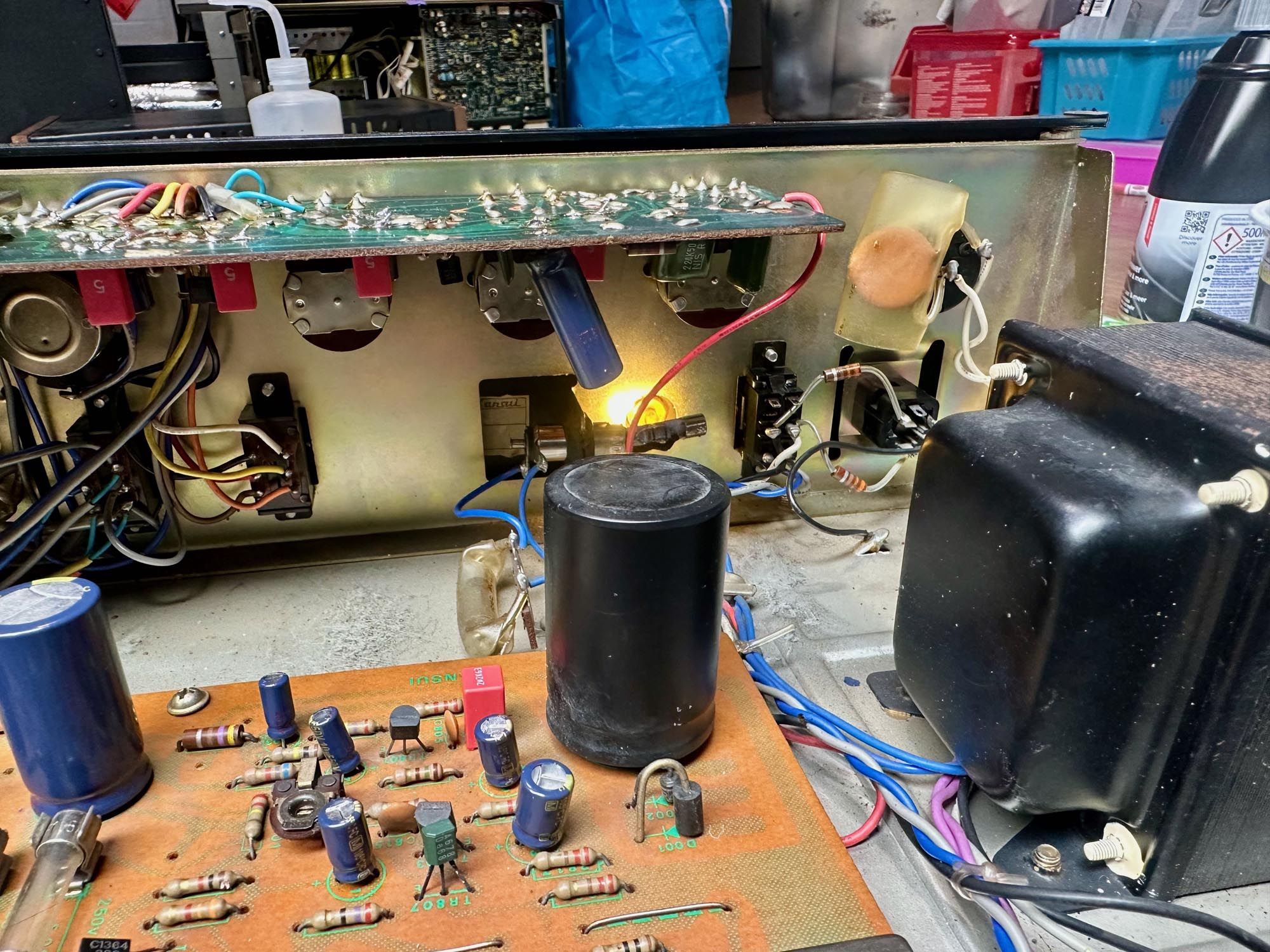 Na 50 jaar is het niet vreemd dat de condensatoren niet meer in topconditie zijn. Wat mij opvalt aan oude versterkers is de hoge kwaliteit van de toen gebruikte condensatoren. Vele geven nog steeds mooie meetwaarden. Maar… net zo gemakkelijk kan er eentje defect zijn. Aan de buitenkant zie je hier niks van maar bij meting wordt dit duidelijk. Zo ook bij deze Sansui versterker. Een 100uF elco bleek een waarde te hebben van nog geen 1uF. Zijn broertje van het linkerkanaal is meet nog perfect. De koppelcondensatoren hebben stuk voor stuk een erg hoge ESR wat een goede weergave in de weg staat. Ook hun capaciteit bleek niet meer binnen de norm.