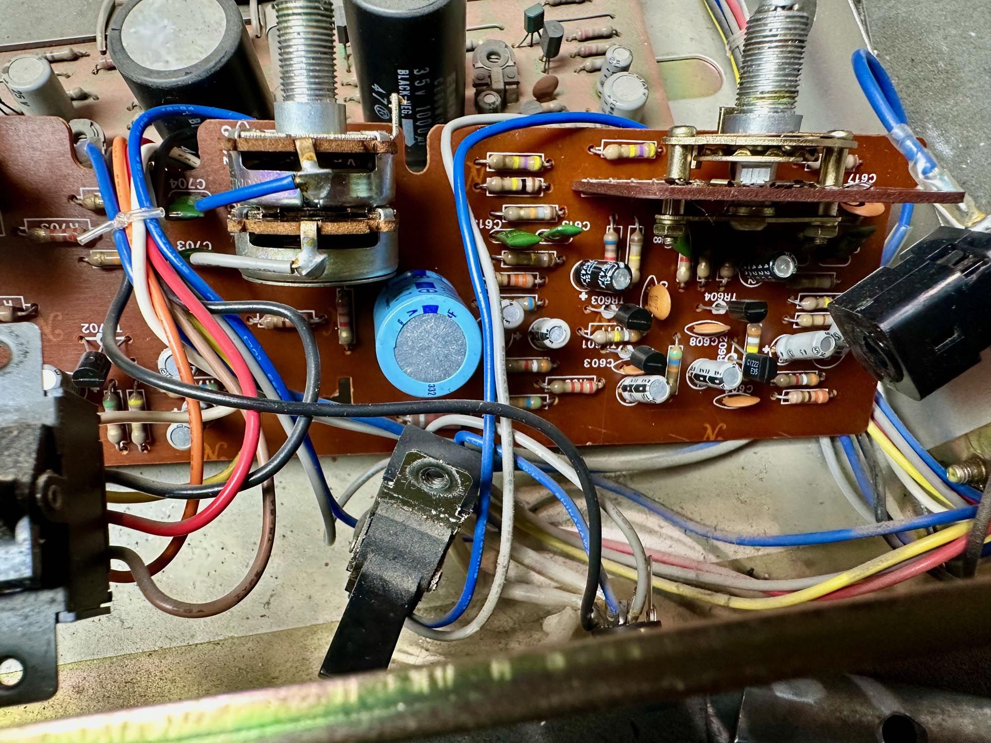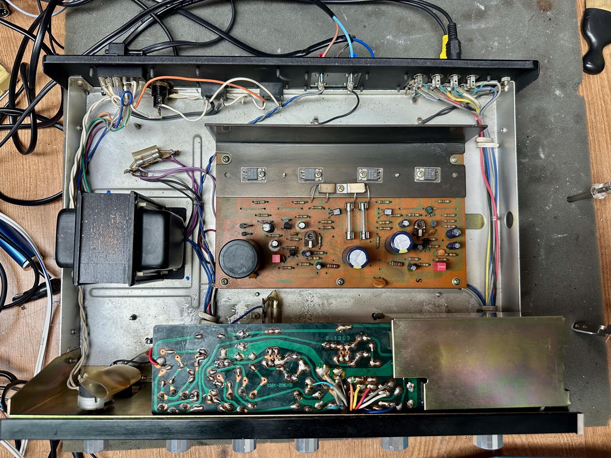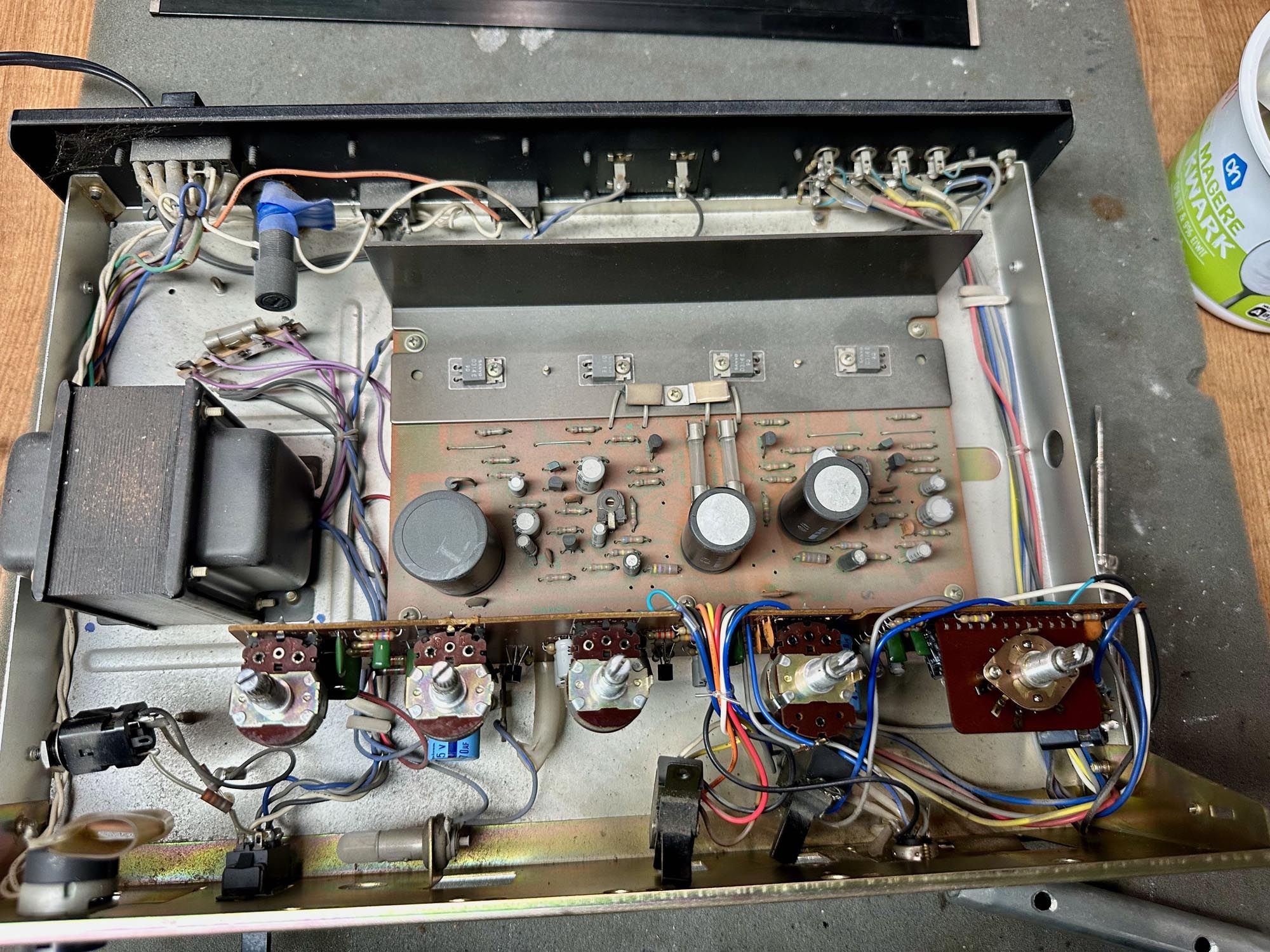 Deze Sansui is een mooi voorbeeld van de tijd. Een praktische behuizing met twee printplaten. De potmeters rechtstreeks op de print gemonteerd maar de schakelaars nog wel voorzien van losse draden. De aansluiting voor de luidsprekers was in die tijd nog op basis van een schroefsysteem.