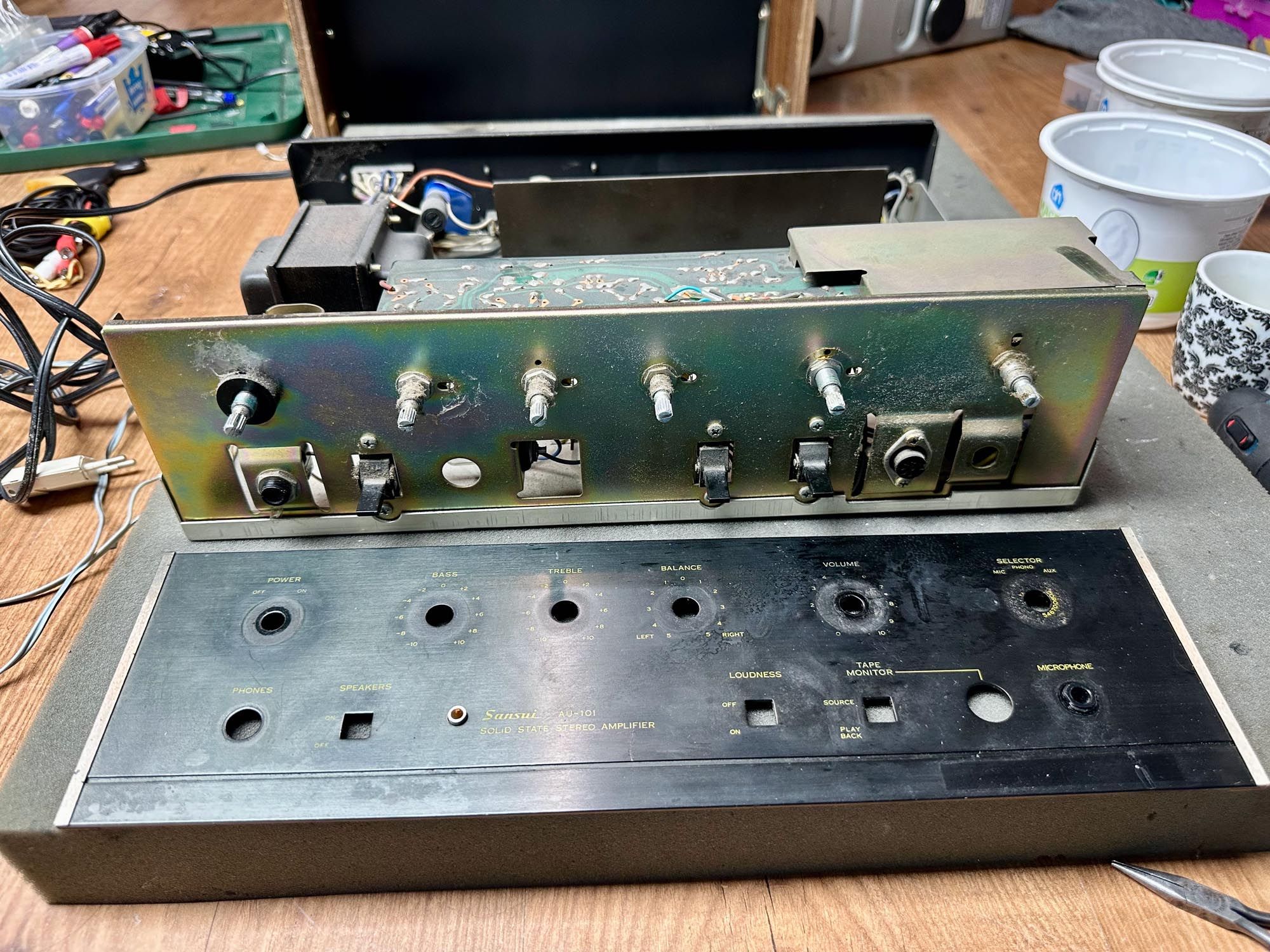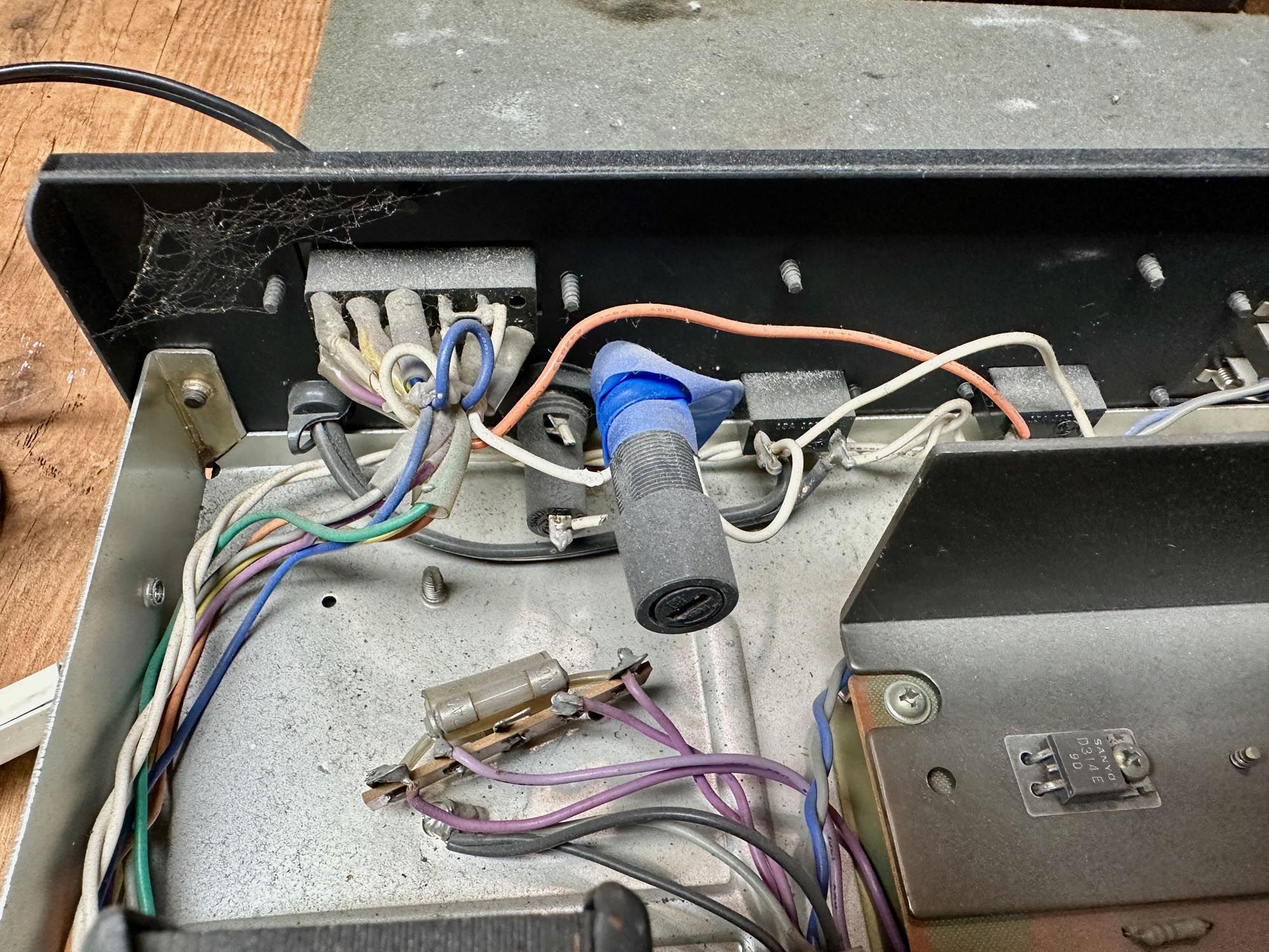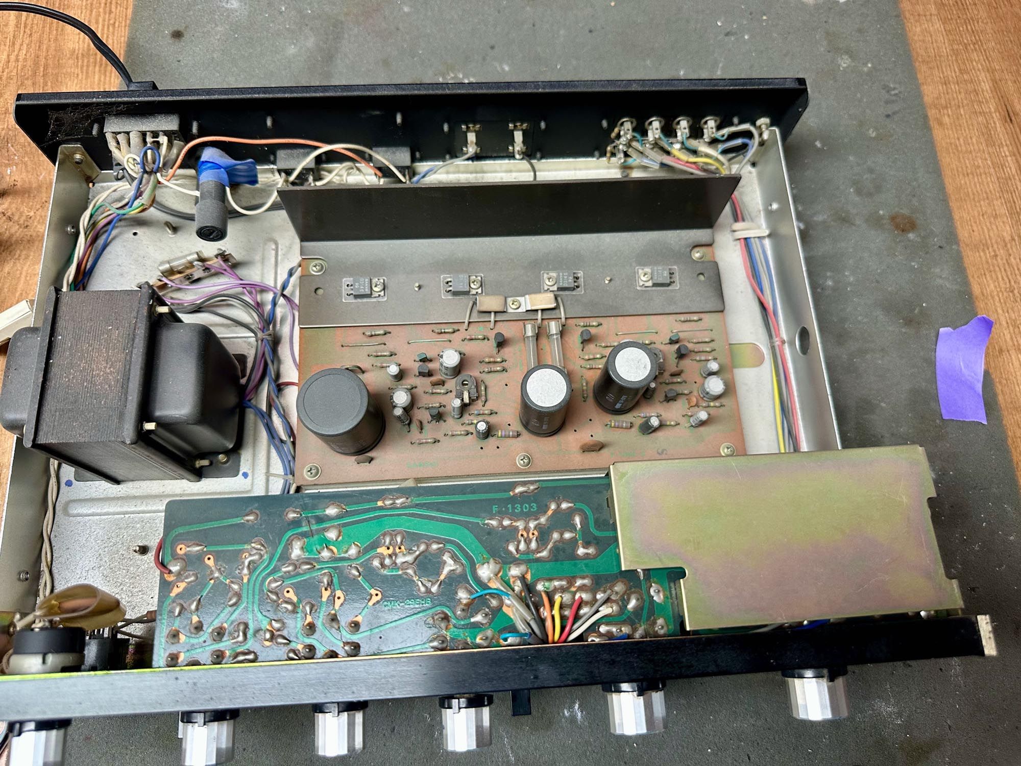 Deze Sansui is een mooi voorbeeld van de tijd. Een praktische behuizing met twee printplaten. De potmeters rechtstreeks op de print gemonteerd maar de schakelaars nog wel voorzien van losse draden. De aansluiting voor de luidsprekers was in die tijd nog op basis van een schroefsysteem.
