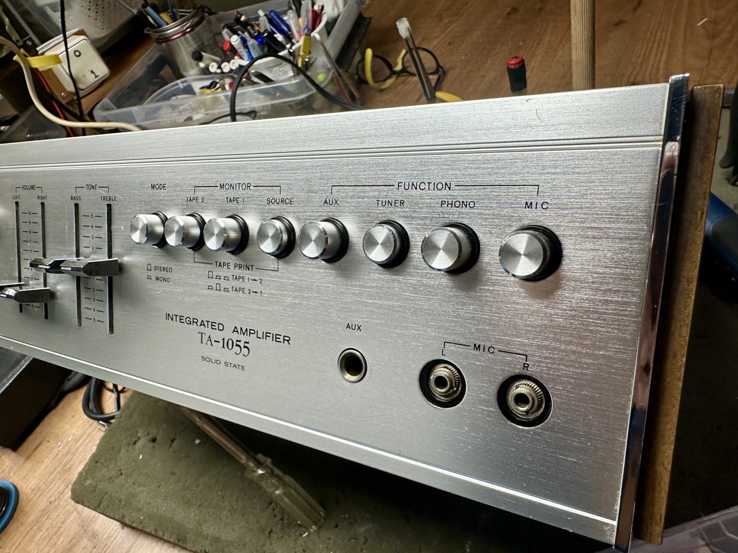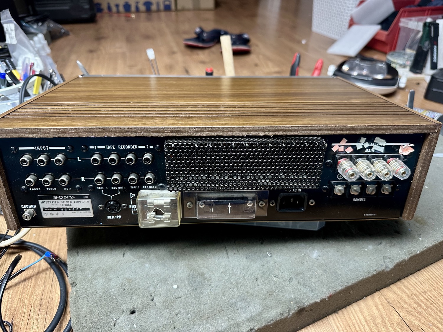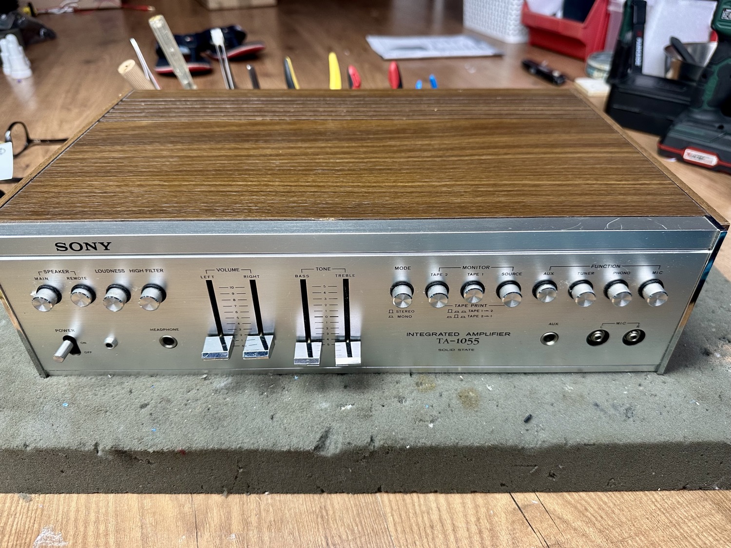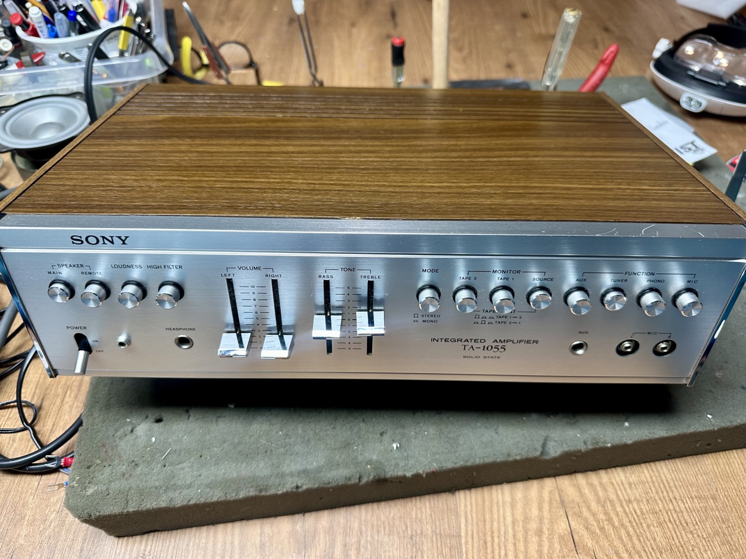 Deze Sony TA-1055 had voor zijn tijd een heel net vermogen van 2x 23 watt bij 8 ohm. Door zijn lage dempingsfactor van 22 zal hij waarschijnlijk "vintage warm" klinken. Maar bij binnenkomst was er niks vintage warm aan. Slechts één kanaal werkte (redelijk) goed en het andere vertoonde de nodige kuren. Na het onderhoud en het vervangen van de nodige componenten kon hij weer in gebruik genomen worden.