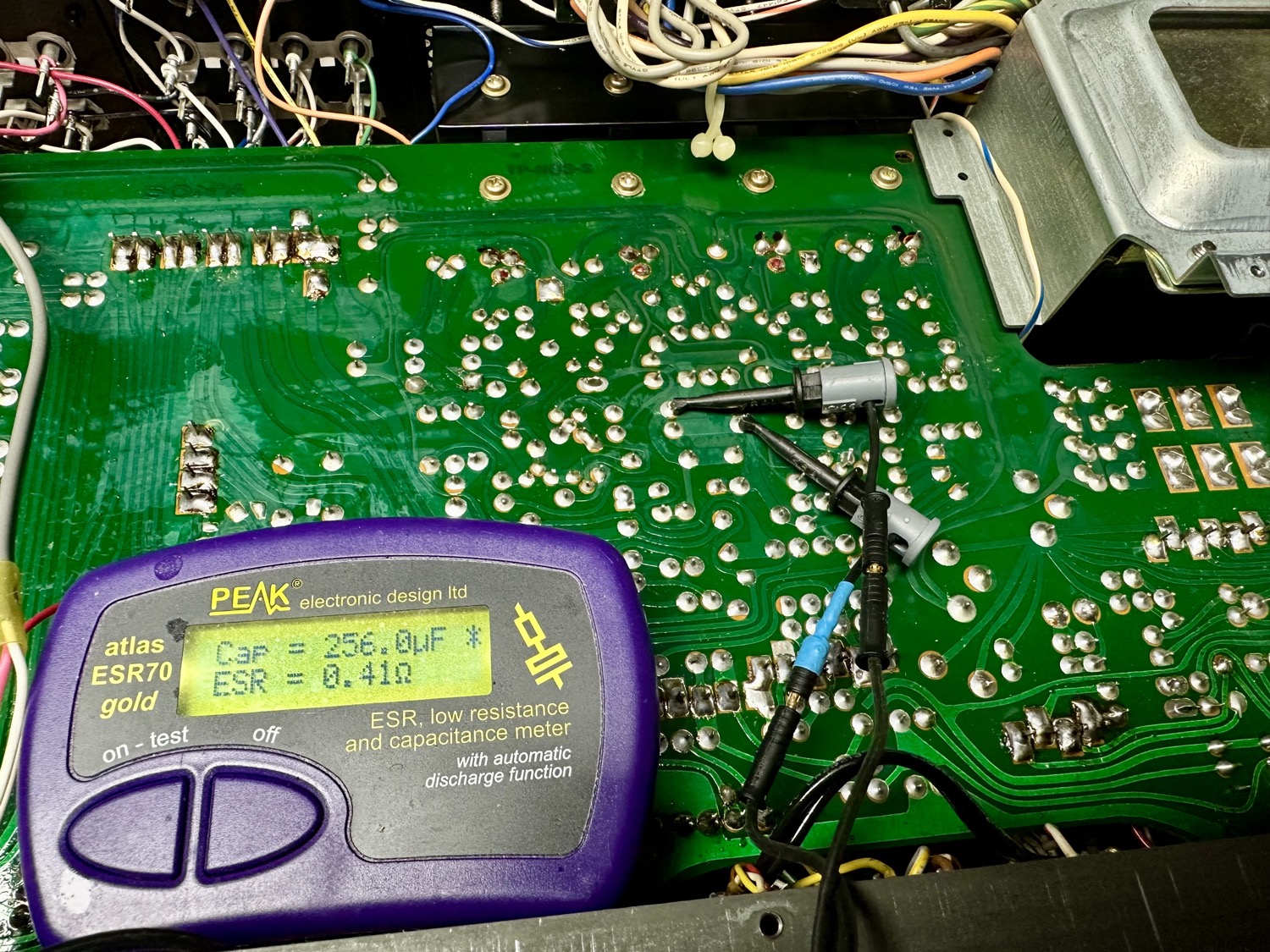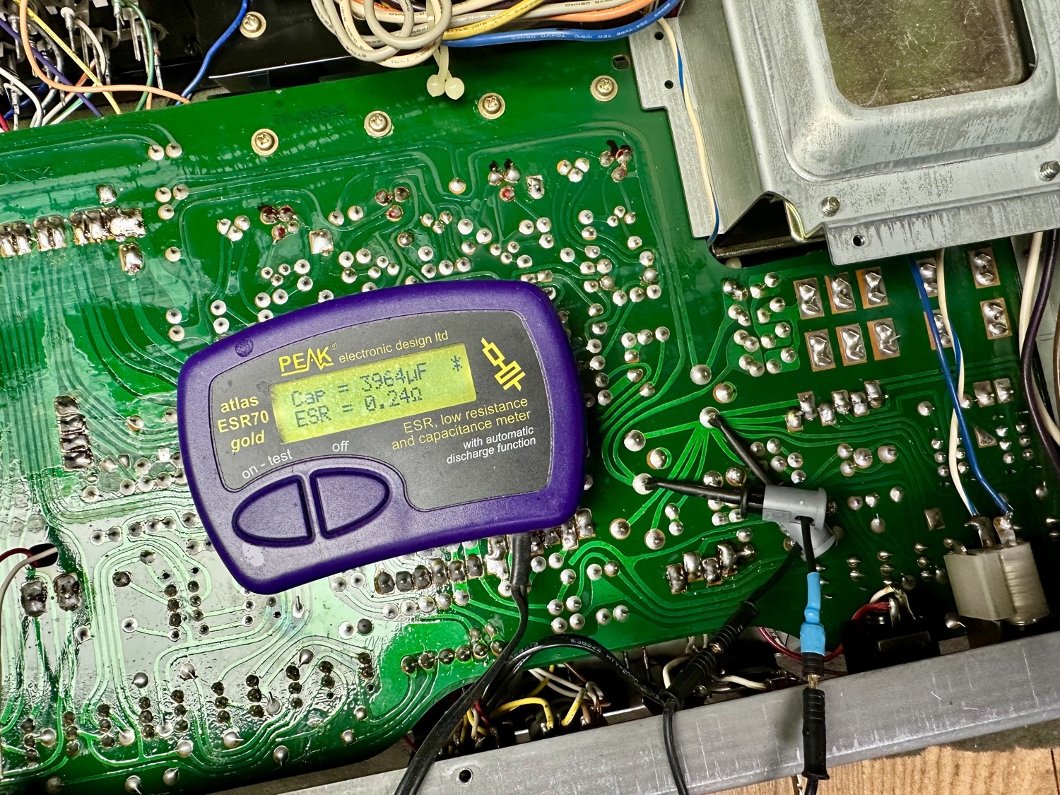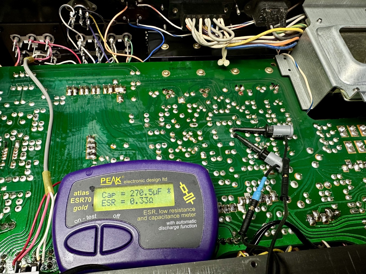 - Condensatoren doorgemeten. Alle "grote" elco's zijn nog in prima conditie. Vooral de kleinere waardes hebben een nogal hoge ESR en zijn behoorlijk wat van hun capaciteit kweit.