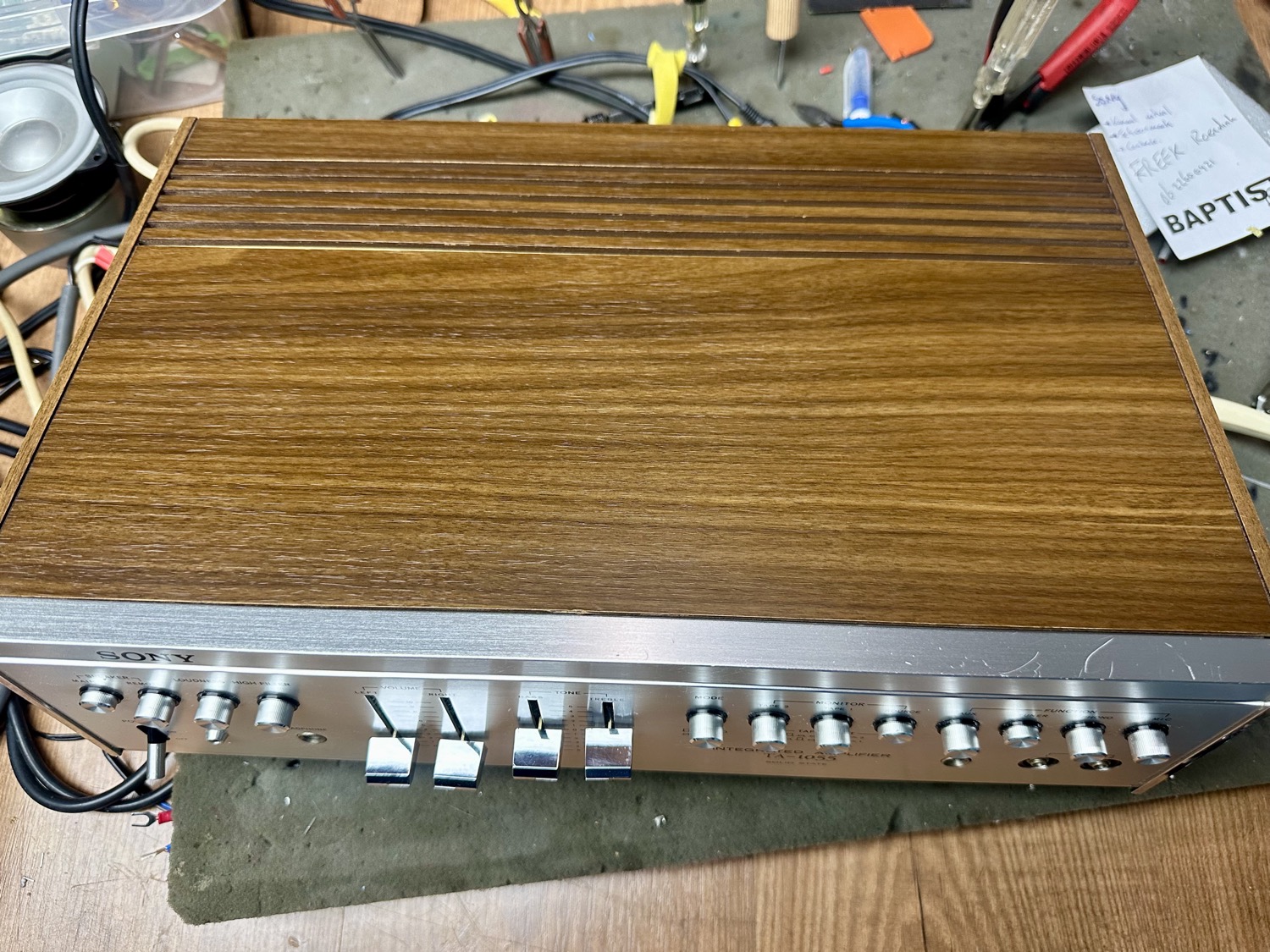 Daar staat hij, een echte Sony versterker uit de begin jaren 70. Met zijn kenmerkende ronde knoppen en vier verticale schuifpotmeters. Een mooie houten gefineerde behuizing en een Chrome en aluminium front.