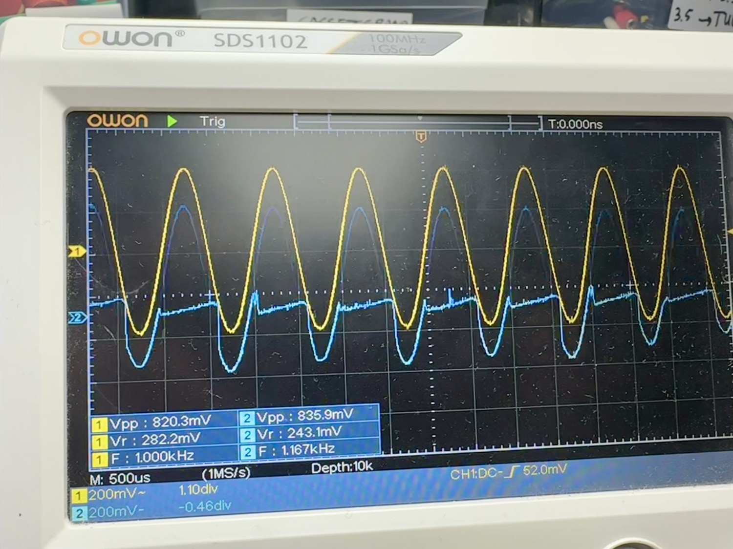 - Bij het aanzetten komt het rechter kanaal pas later in en is nogal vervormd. Foto van de oscilloscoop is niet geheel representatief omdat het beeld constant wisselde.