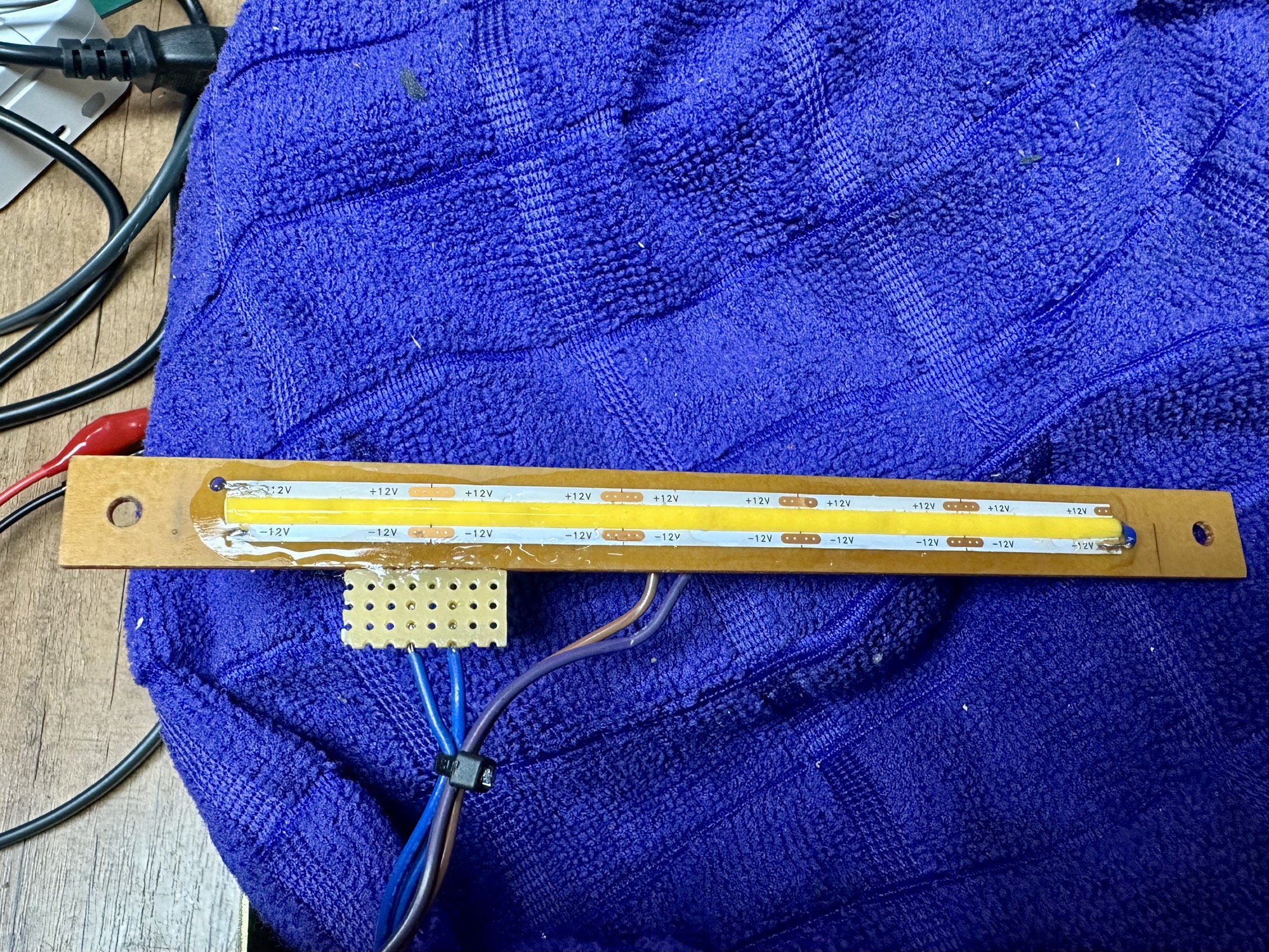 - COB led voorzien van 68ohm voorschakelweerstand. Hierdoor stroomt er +/- 50mA stroom door de ledstrip.