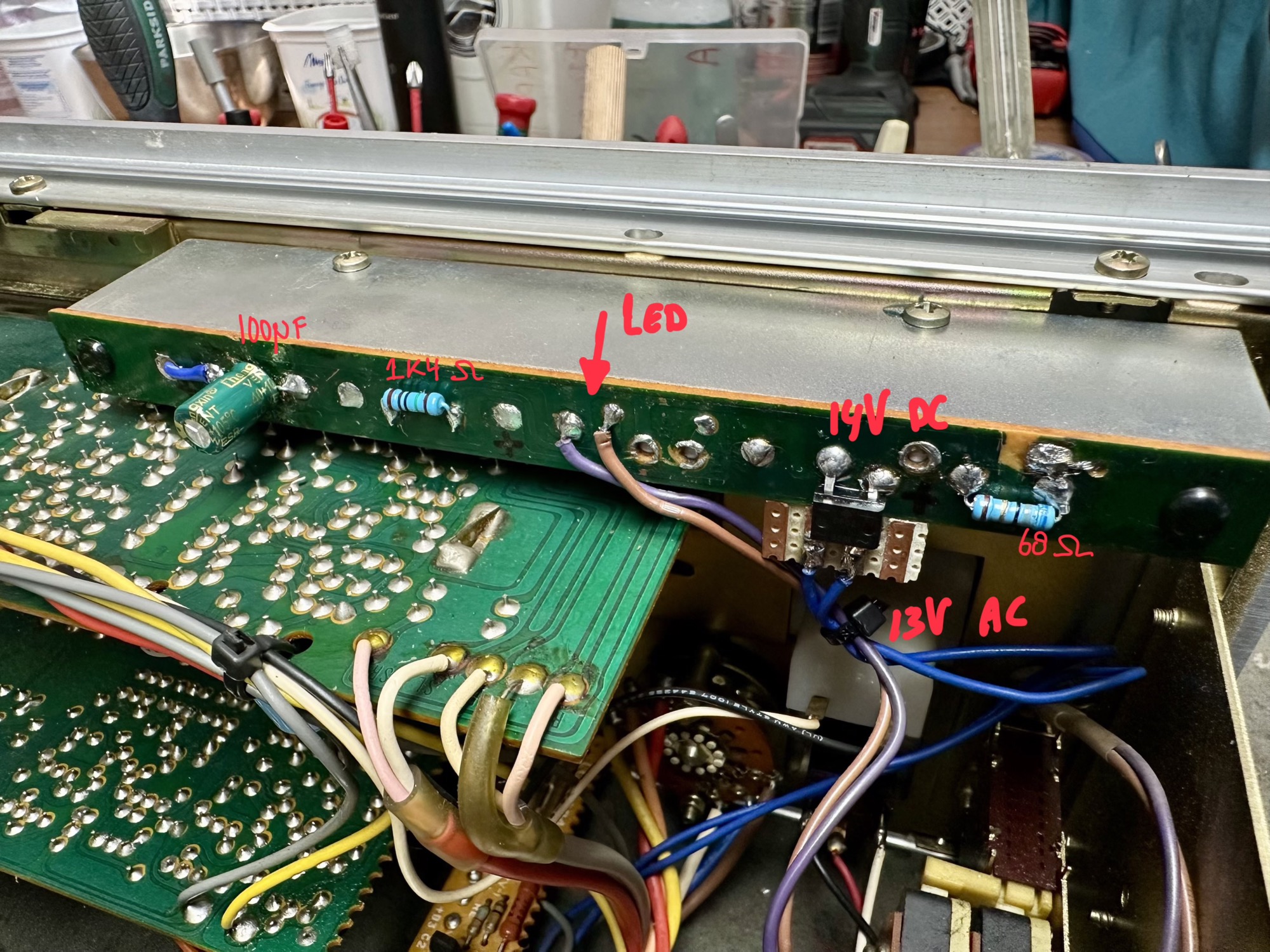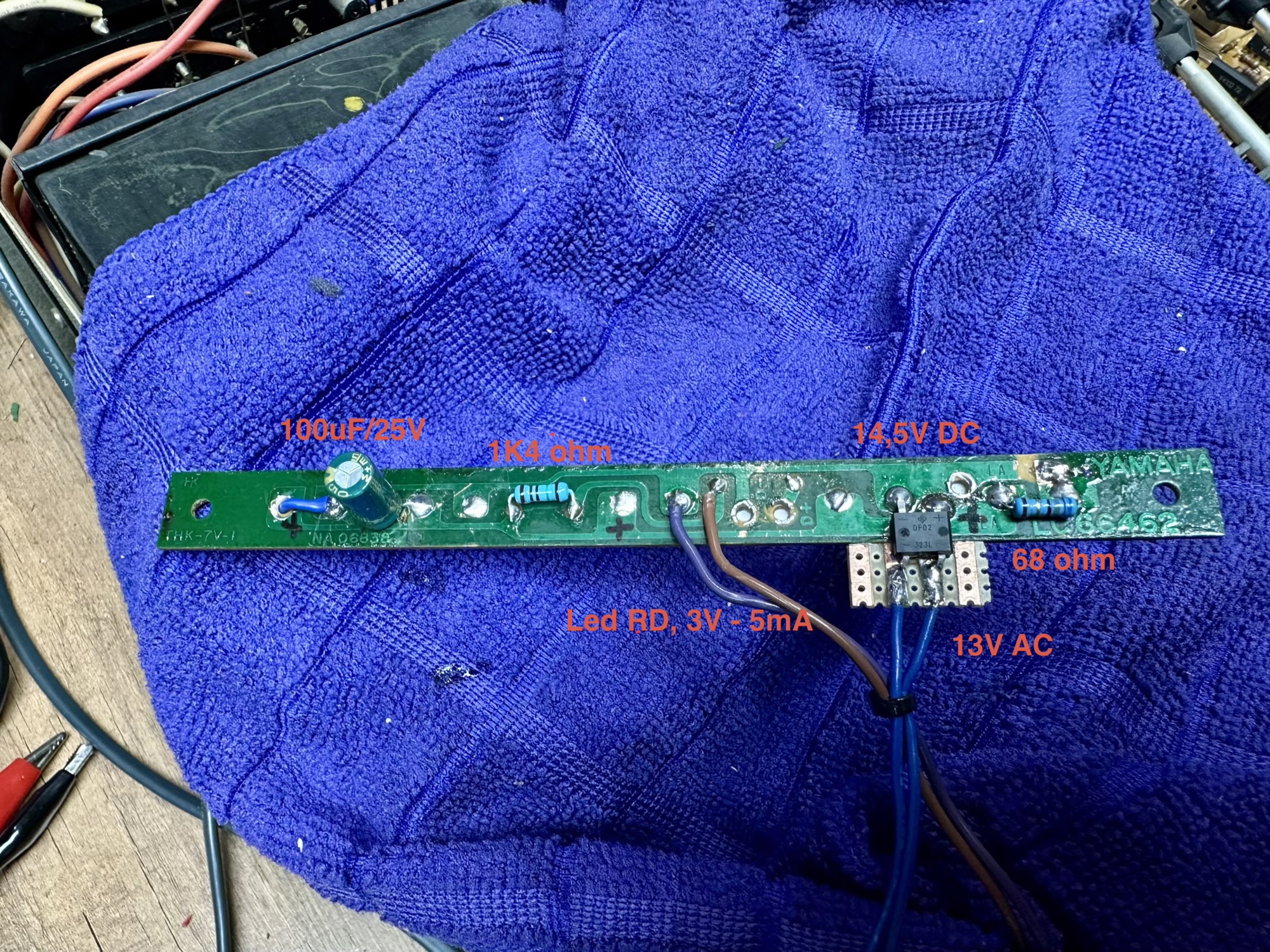 - AC 13V naar DC 14,5v omgezet. 100uF afvlak elco.