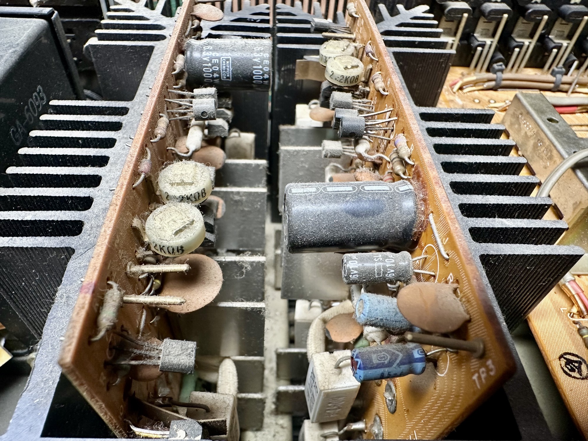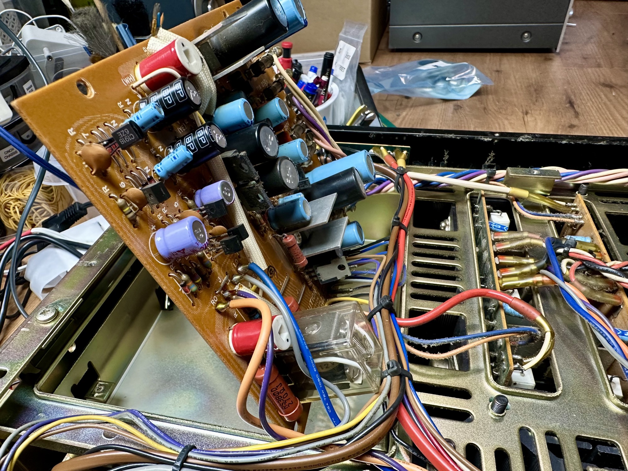 - Diverse condensatoren vervangen. Opvallend is wederom dat alle lichtblauwe tyes nog goed meten. Probleem is de paarse en zwarte versies.