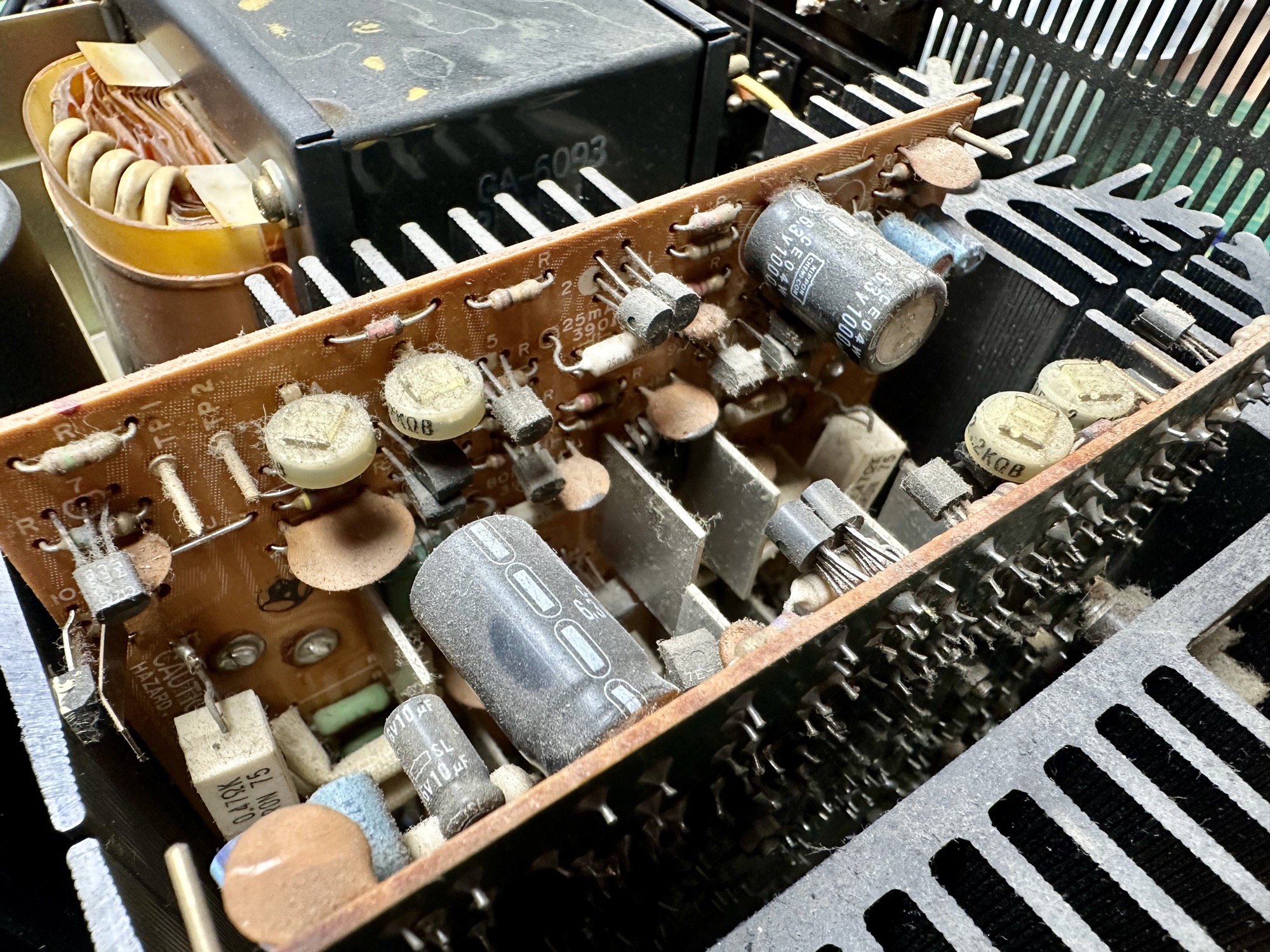 - De voedingsprint heeft warmte vlekken rondom TR410 en TR411. De koelprofielen zaten los van de print en de transistoren.