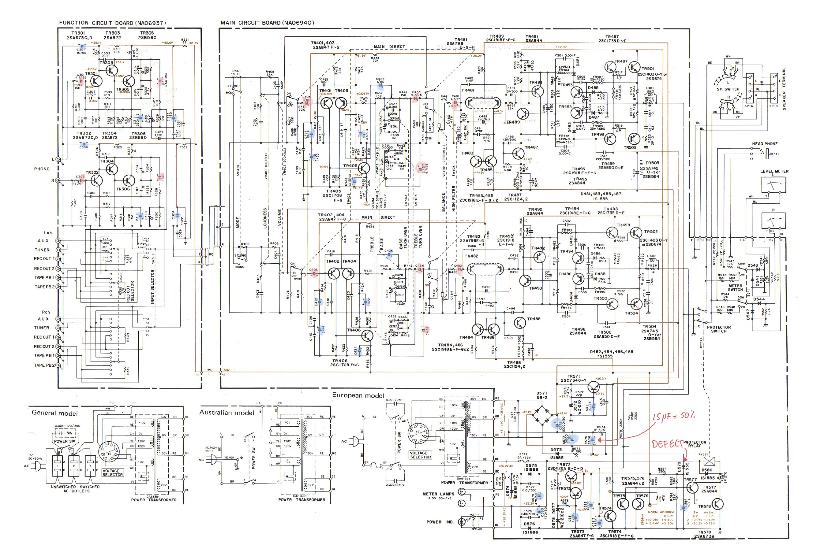- Sinusgenerator aangesloten op de AUX ingang en versterker doorgemeten. Linker kanaal is goed, rechter kanaal defect. TR500 2SA850 is defect. Ter test alle overige transistoren op diode functie doorgemeten. Alles lijkt goed. TR500 vervangen door 2SA1013.