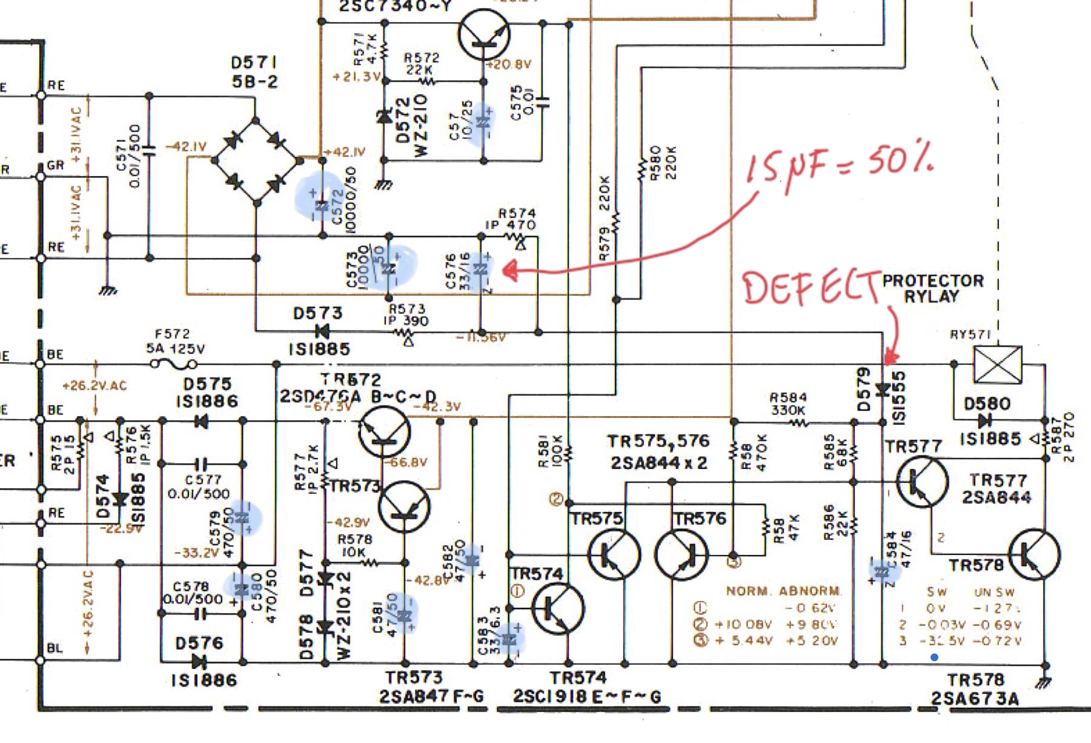 - En ja hoor, ik heb wat over het hoofd gezien. De redelijk verstopte Condensator C565 blijkt geen 33uF maar slechts 15uF te meten. Ook diode D579 blijkt defect. Deze twee onderdelen vervangen en het relais schakelt na 4 seconden weer netjes aan zoals het hoort.