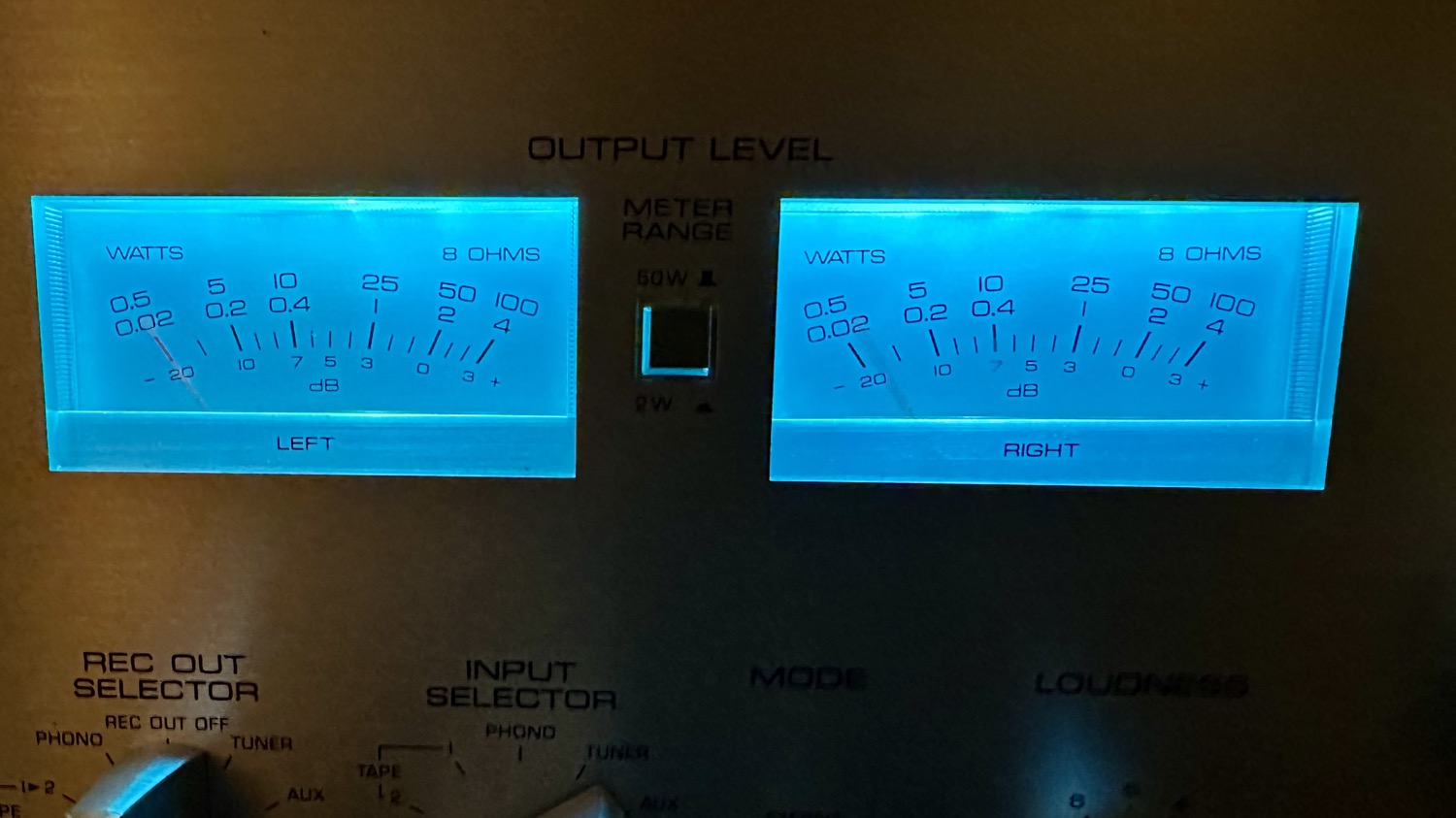 De schakelaar gaat op ON, de zacht blauwe verlichting van de VU meters gaat aan en na vier seconden klinkt het luidspreker relais met een zachte tik aan.