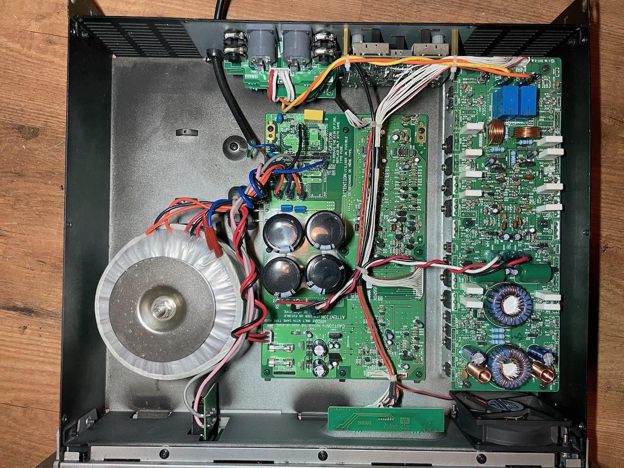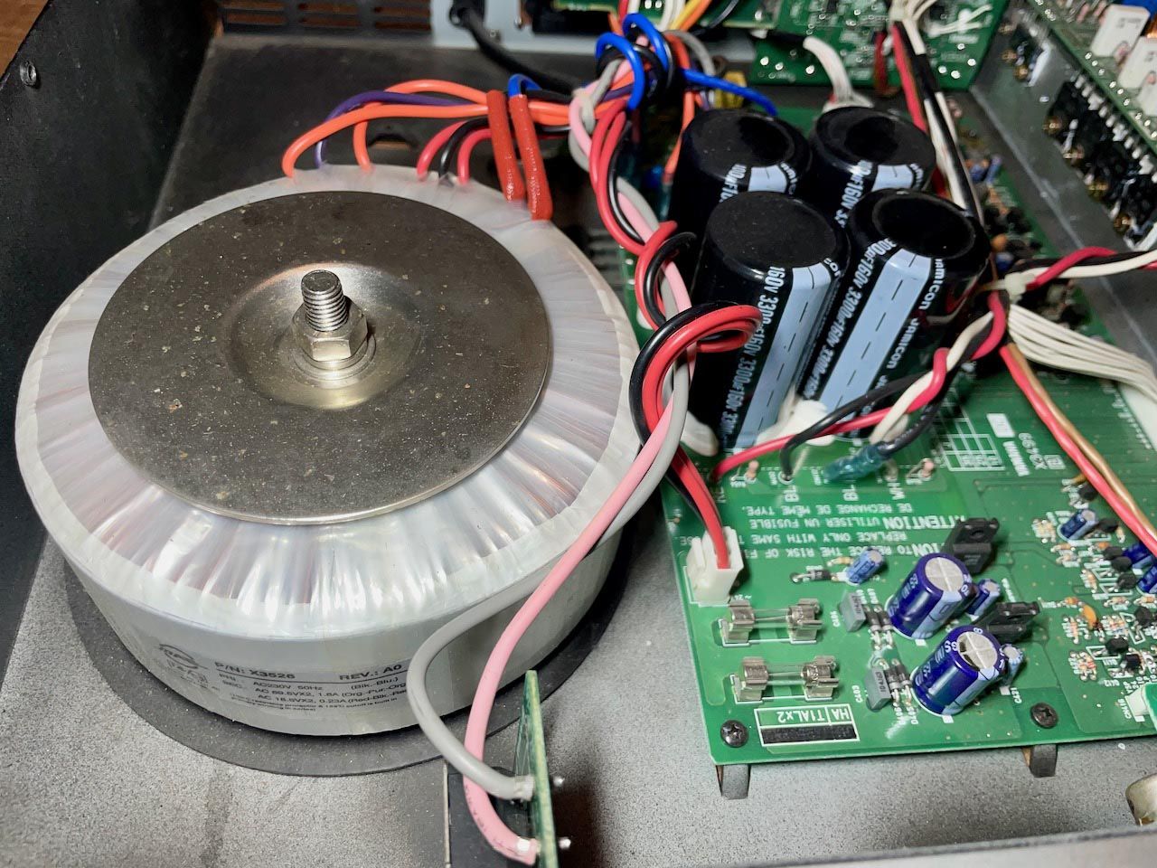 De opbouw is bijzonder overzichtelijk. Een grote ringkerntrafo, een voedingsboard en de eindversterker. Dankzij deze opbouw is hij ook erg gemakkelijk te servicen. De eindversterker zit met zes goed toegankelijke schroeven vast op de behuizing. Ook de aansluitkabels voor de voedingsspanning, de luidsprekeruitgang en de aansturing zijn eenvoudig los te maken. Hierna haal je de complete versterkerprint met koelplaat uit de behuizing.