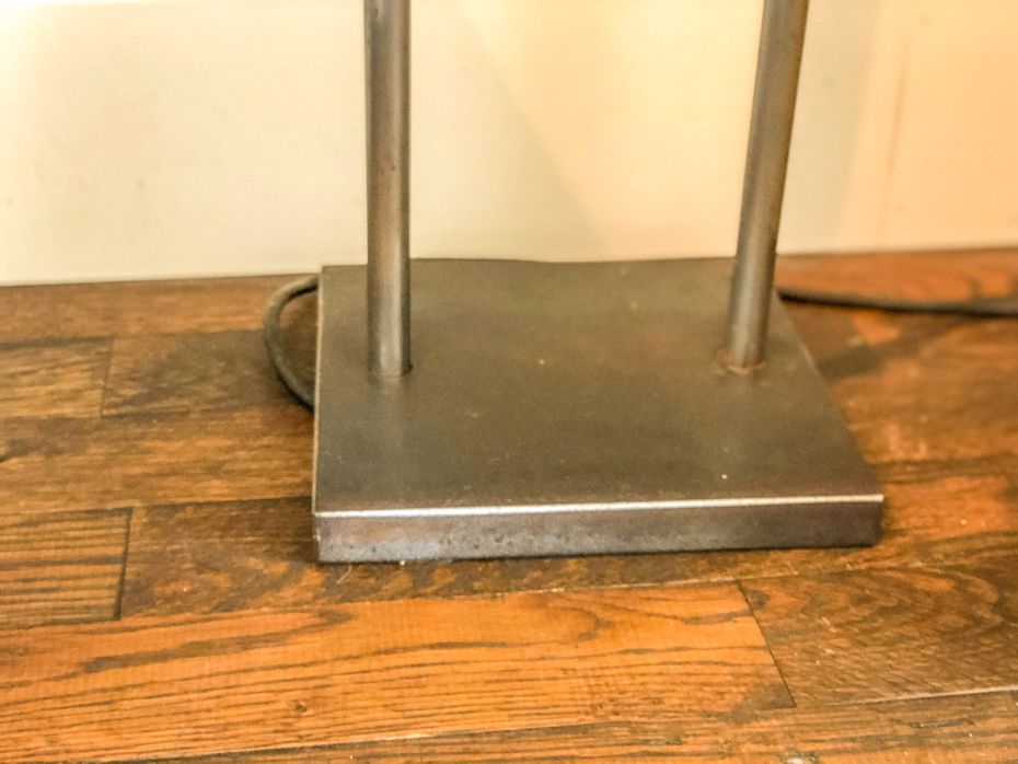 Ontwerp een staande lamp van hout en metaal die dichtbtegen de muur geplaatst kan worden.