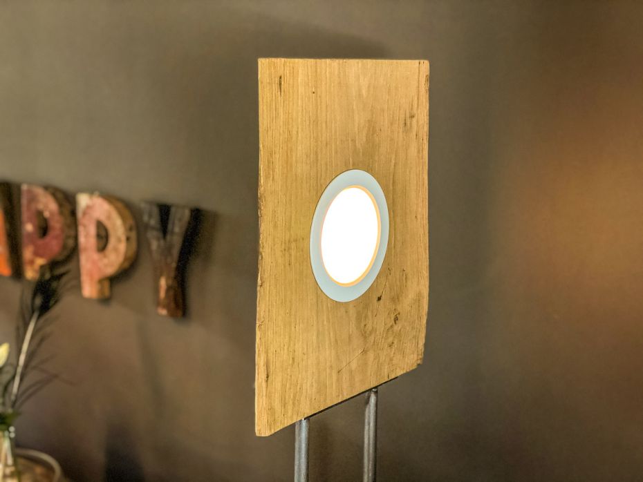 Deze staande designlamp is voorzien van een zware volmetalen voet met daarop twee holle ronde staanders. Op deze sierlijke poot is een massieve eikenhouten plank geplaatst. De ledverlichting is in deze schijf ingefreesd voor een nog strakker resultaat. Deze ledlamp is met een afstandsbediening dimbaar en in alle kleuren instelbaar.